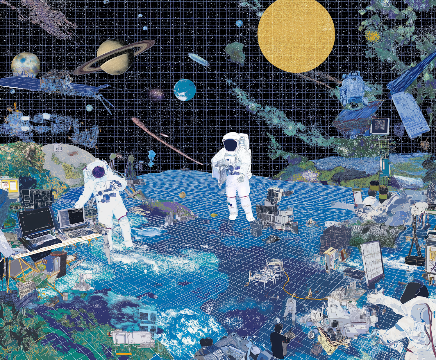 A colorful and detailed illustration of astronauts exploring a futuristic space environment with planets and technology.