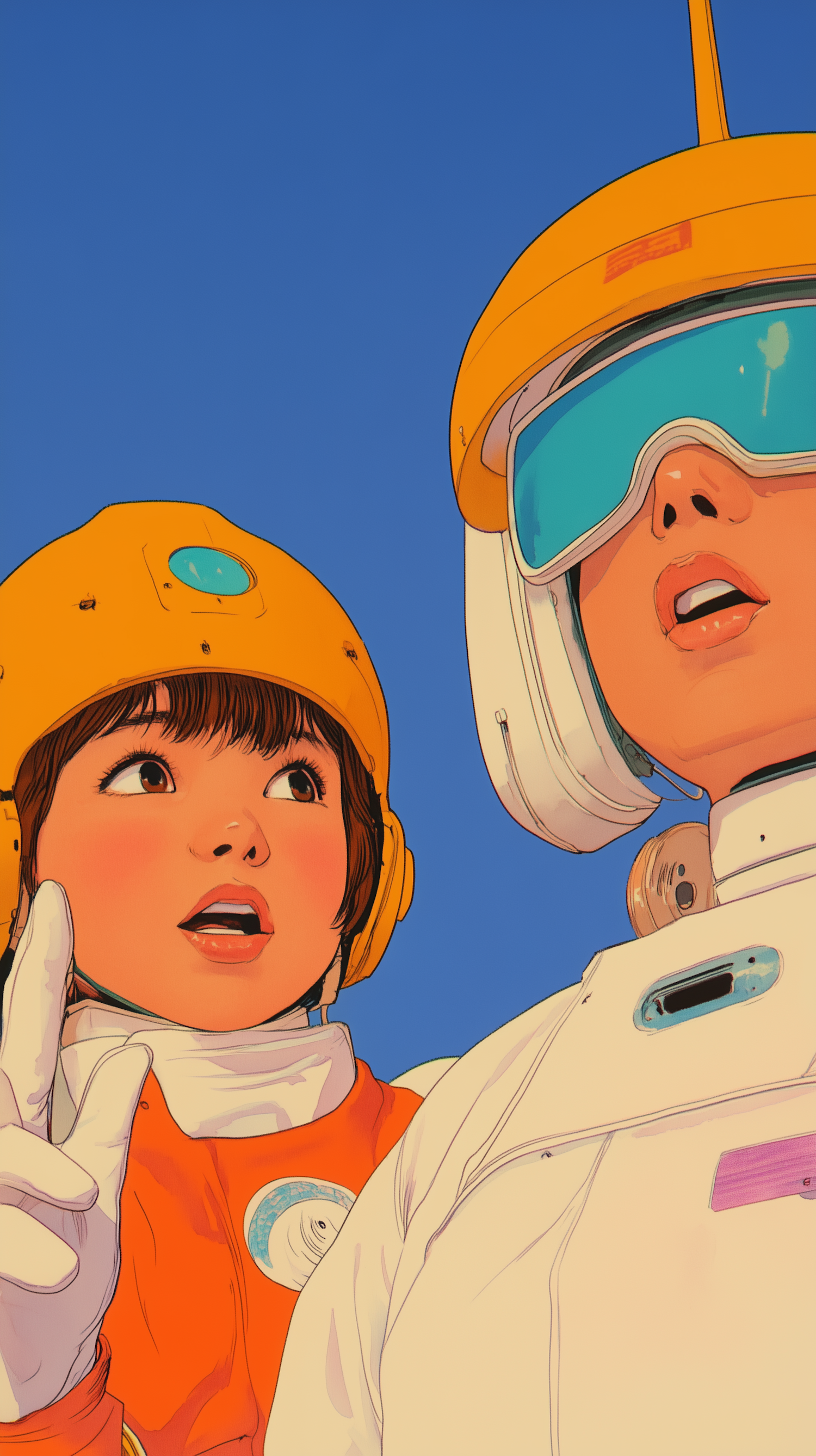 Futuristic illustration of two individuals in space suits and helmets, gazing upwards with expressions of curiosity and wonder.