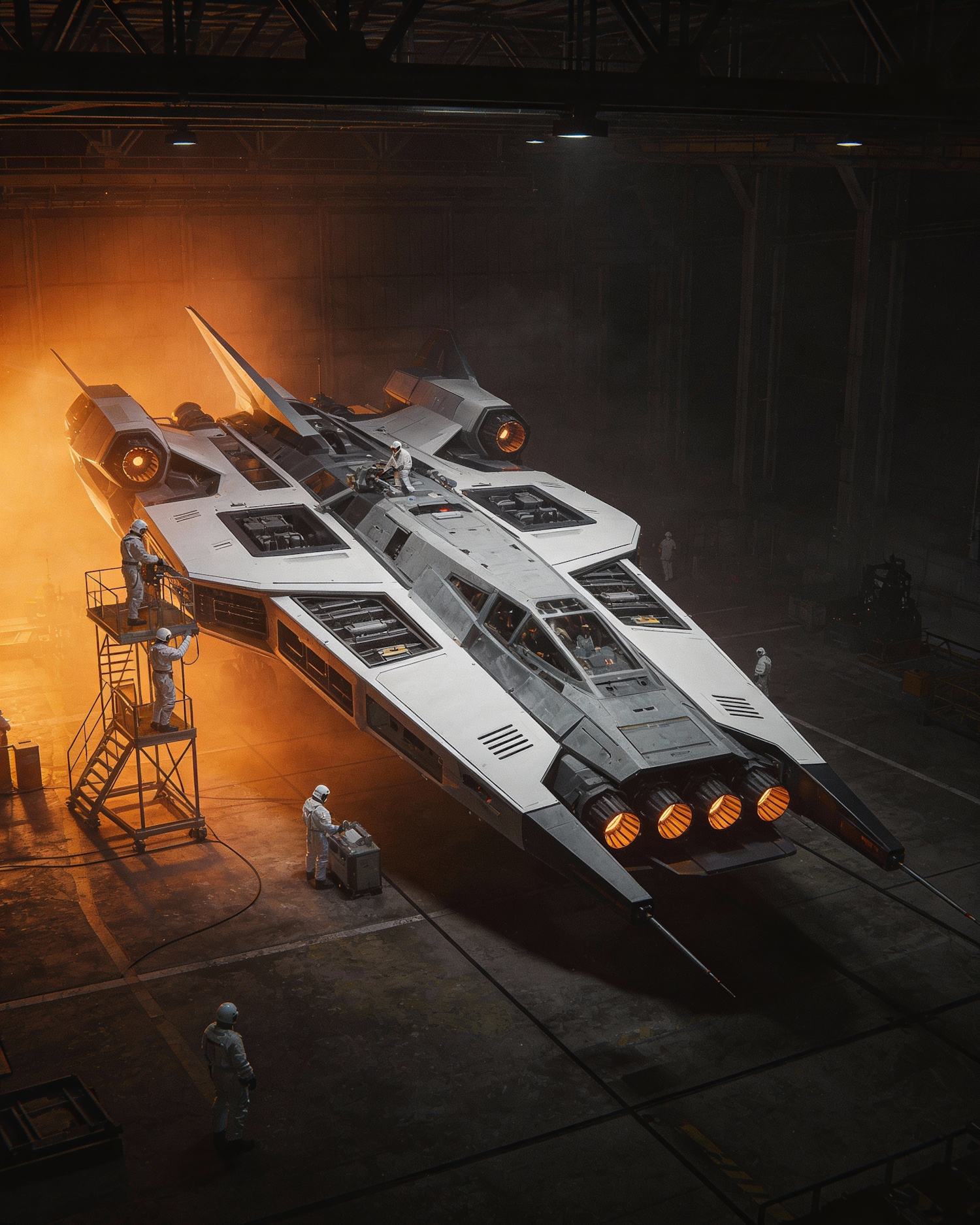 A sleek futuristic spacecraft in a hangar, surrounded by technicians in white suits, with glowing orange thrusters and dramatic lighting.