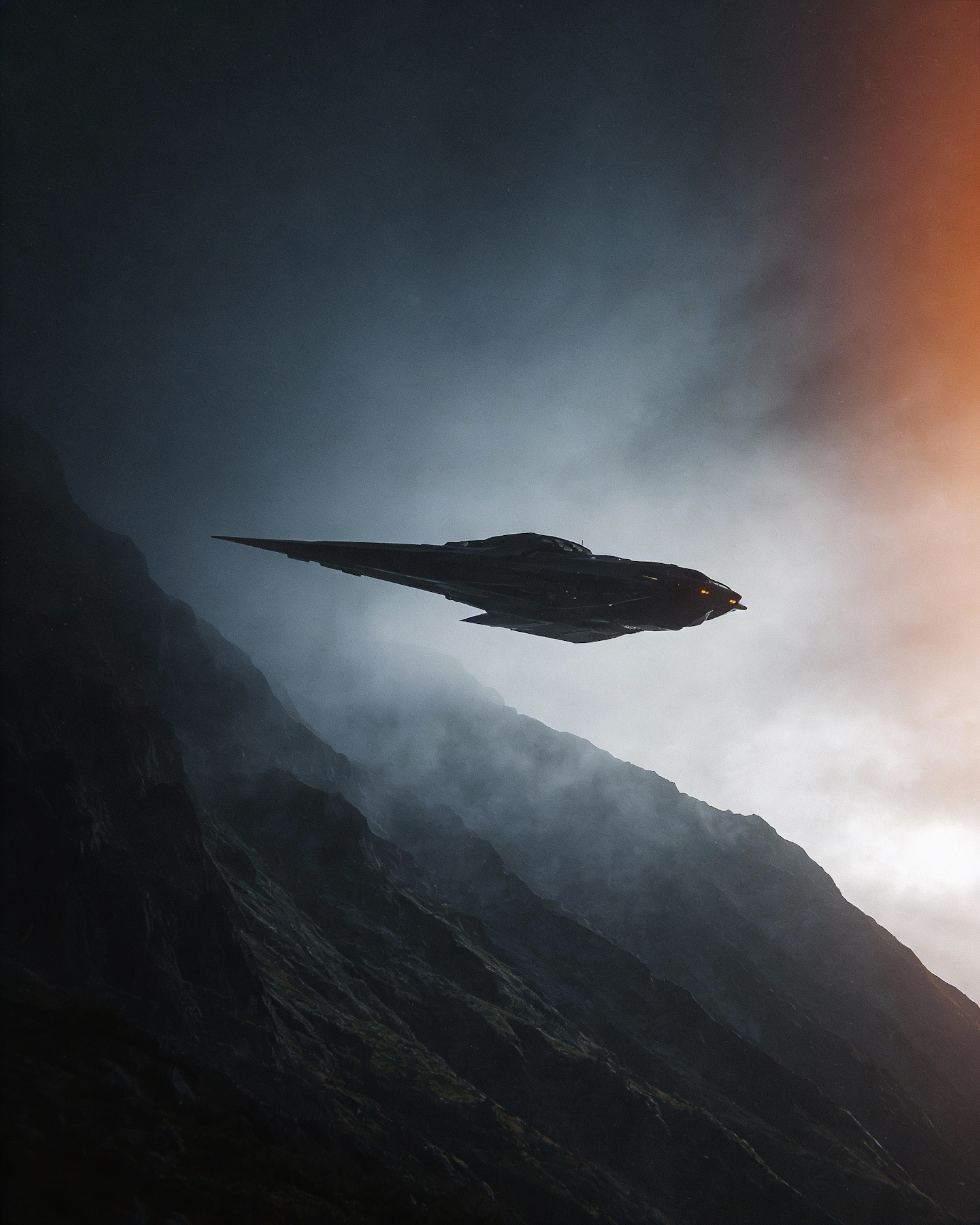 A futuristic spacecraft hovers over misty mountains at dawn or dusk, blending technology with nature in a stunning, atmospheric scene.