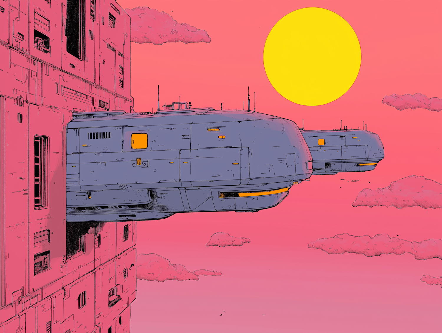 Futuristic cityscape with gray spacecrafts against a pink building and sky, featuring a large yellow sun and pink clouds.