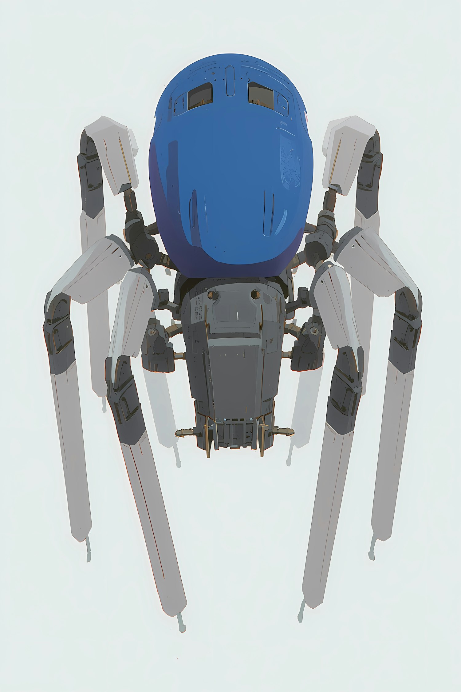 A sleek robotic spider with a blue head and white segmented legs, showcasing futuristic design and mechanical precision.