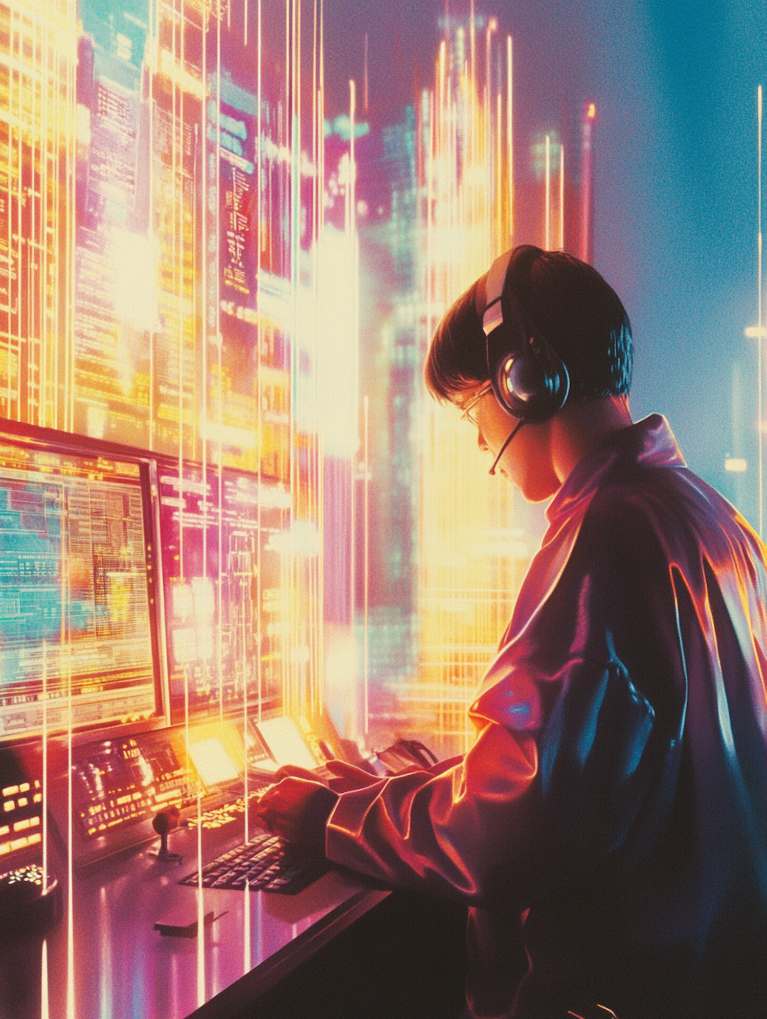 Futuristic scene with a person in a headset working on glowing computer screens, surrounded by vibrant digital graphics.