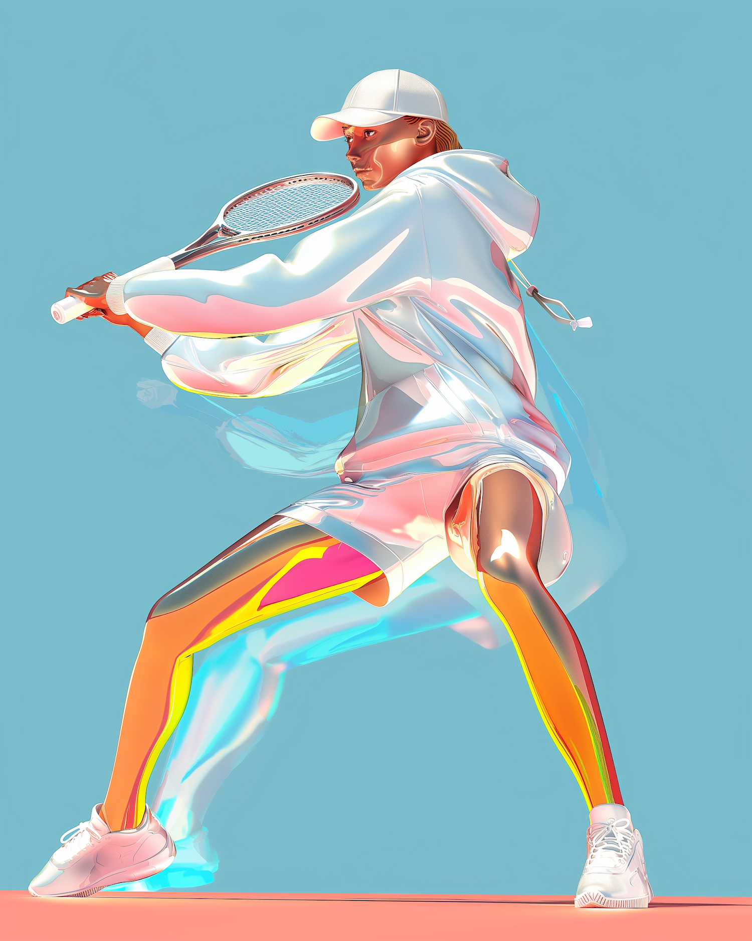 Stylized illustration of a tennis player in action, glowing with vibrant colors and metallic highlights against a clean blue background.