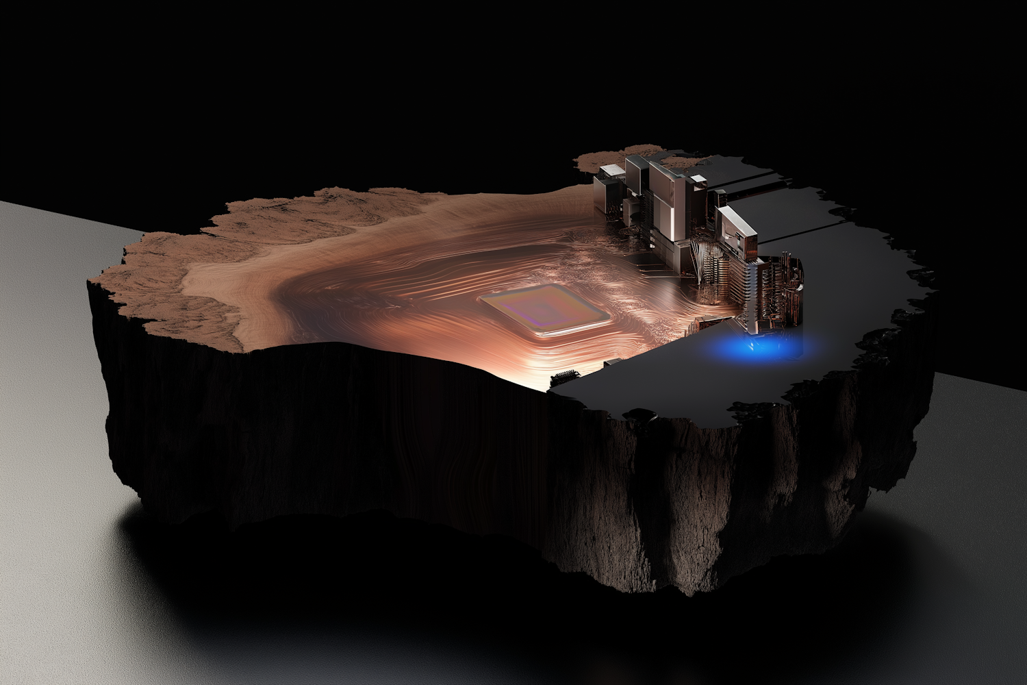A stunning 3D concept of a terrain cross-section blending natural textures with glowing circuitry and futuristic structures.