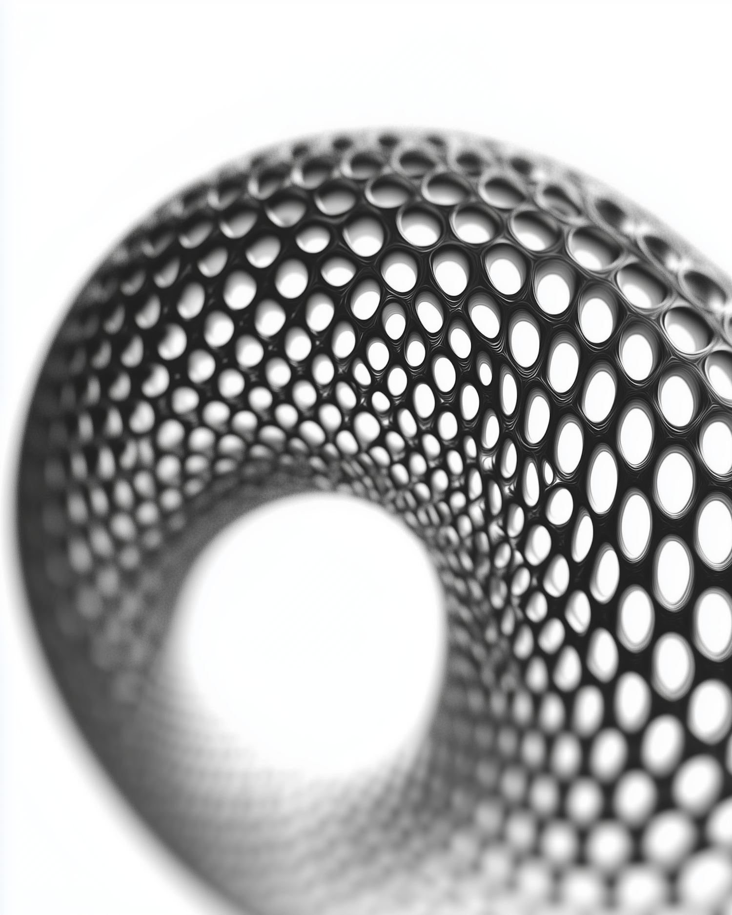 Abstract 3D toroidal structure with a perforated honeycomb pattern, creating depth and contrast against a clean white background.