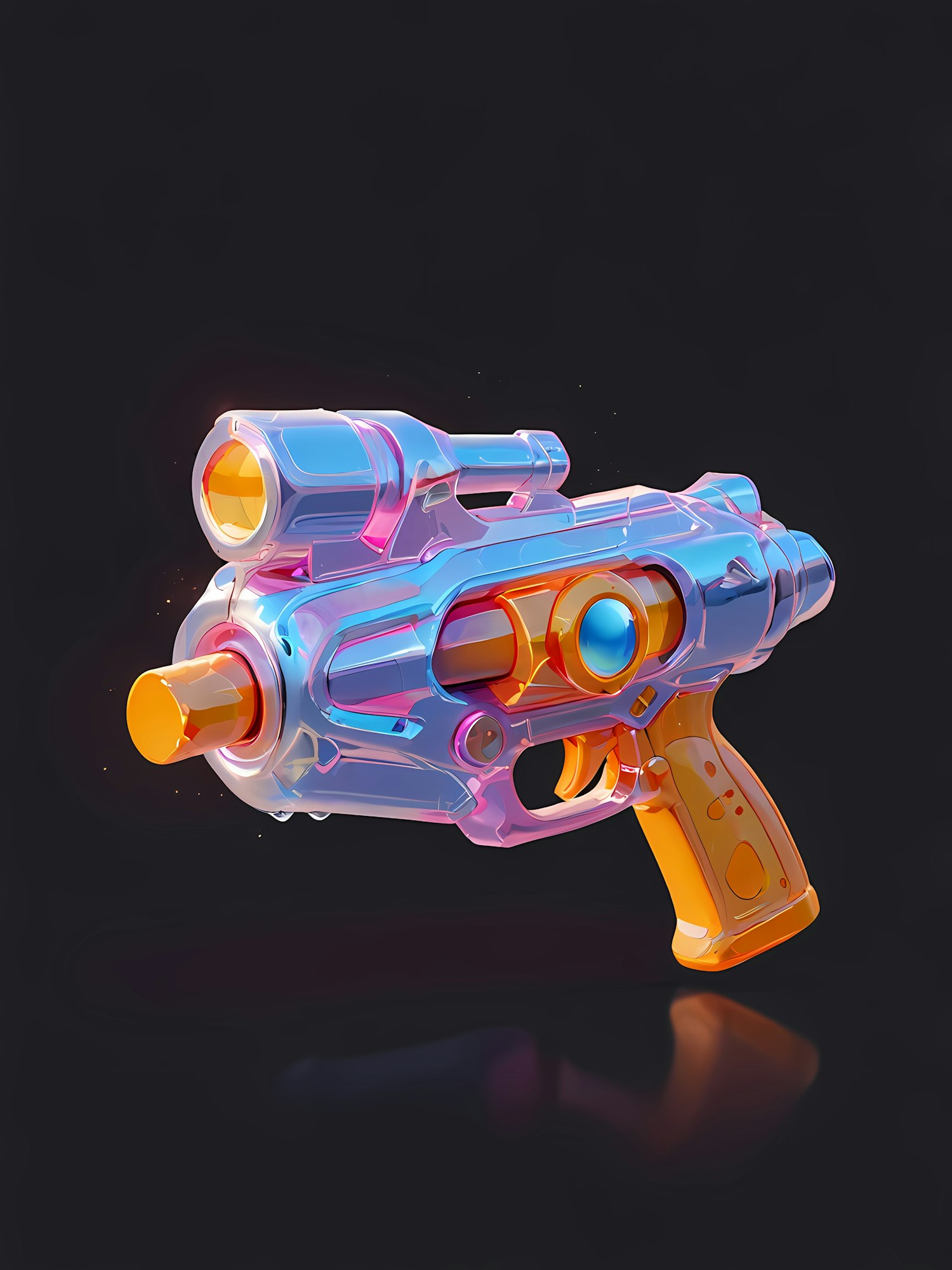 A colorful 3D-rendered toy gun with a sci-fi design, glowing accents, and a sleek metallic finish against a black background.