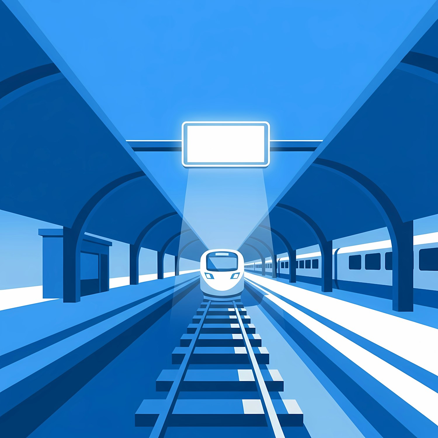 Stylized blue illustration of a modern train station with a sleek train approaching, emphasizing depth and a futuristic aesthetic.