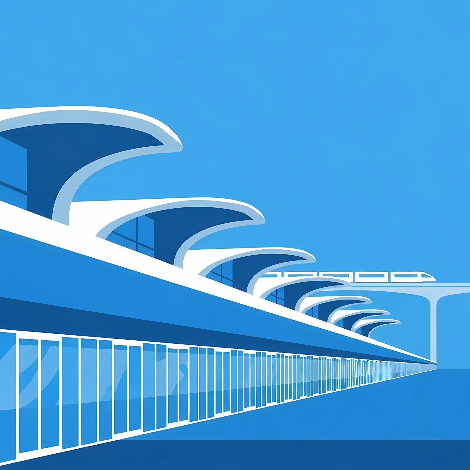 Futuristic transportation hub with sleek architecture, curved roofs, glass facades, and an elevated monorail under a bright blue sky.
