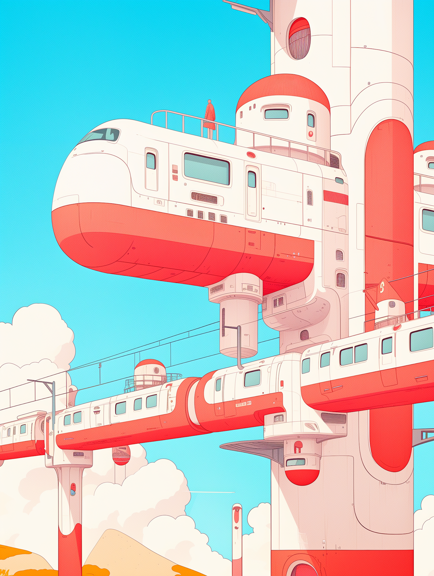 Futuristic transportation system with sleek white and red design, set against a bright blue sky and fluffy clouds.