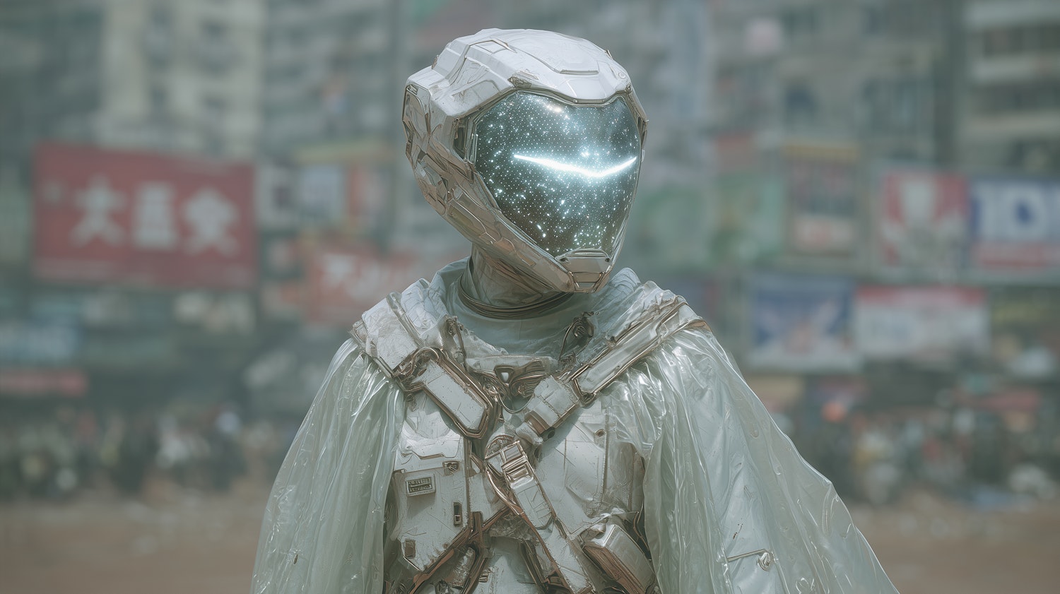 A futuristic humanoid figure in a metallic suit with a glowing visor stands in a bustling urban setting with blurred signage in the background.