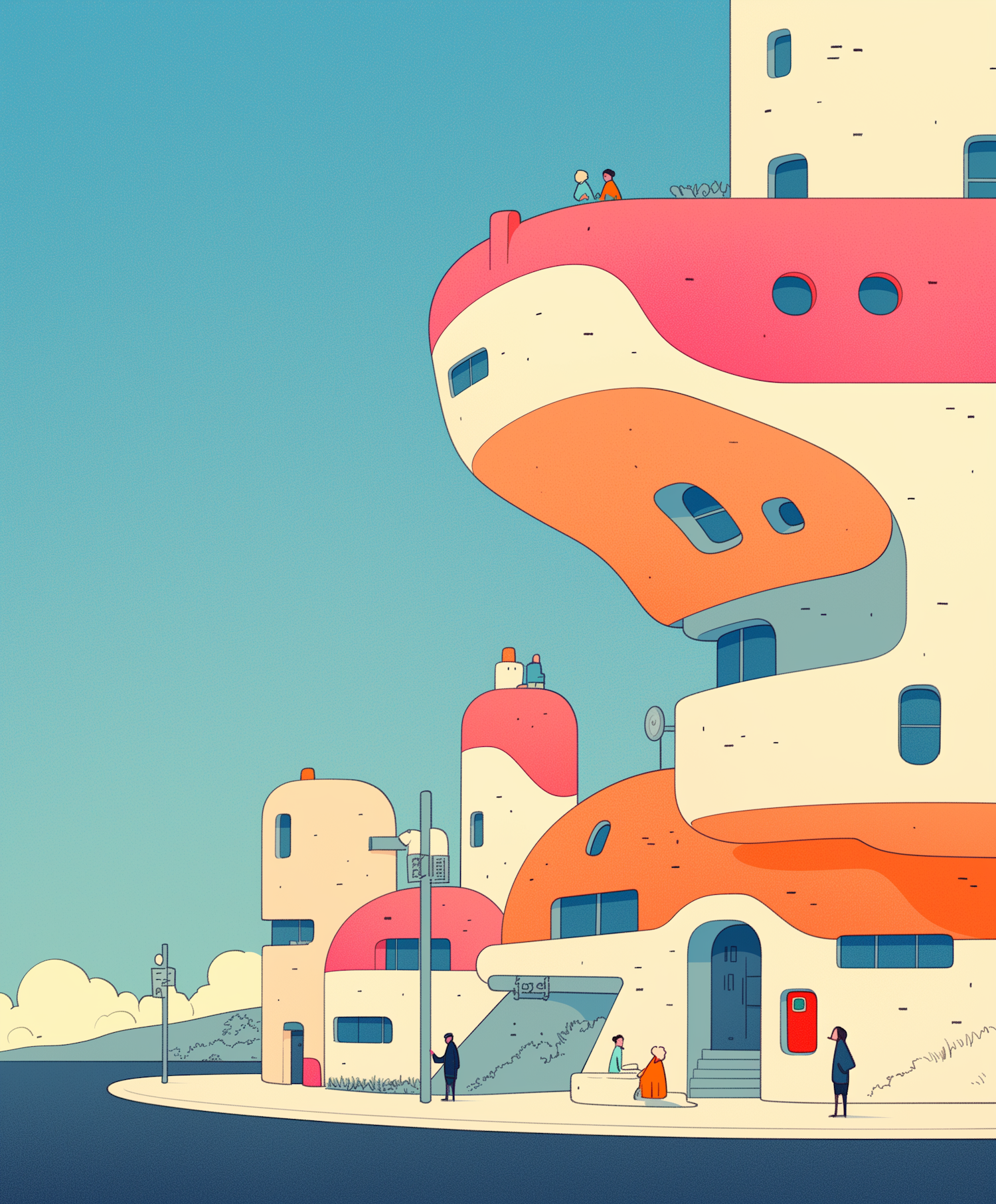Futuristic cityscape illustration with colorful, rounded buildings and minimalistic figures under a clear blue sky.