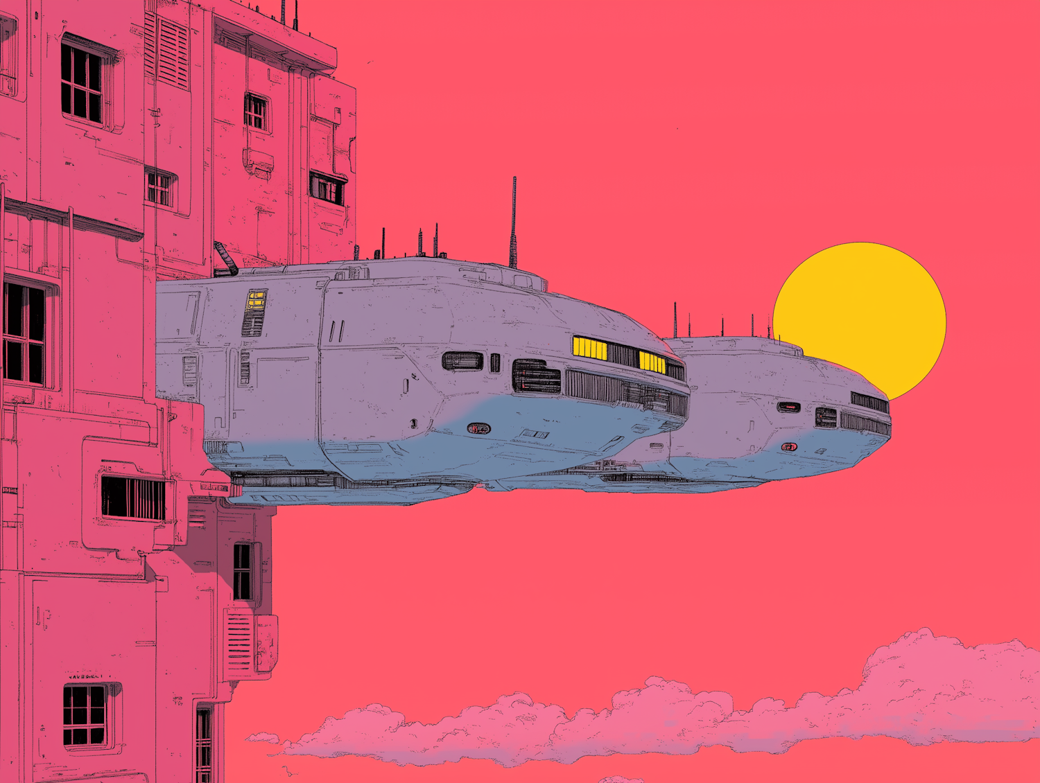 Futuristic spacecrafts docked on a pink building against a vivid pink sky with a yellow sun. Bold sci-fi illustration.