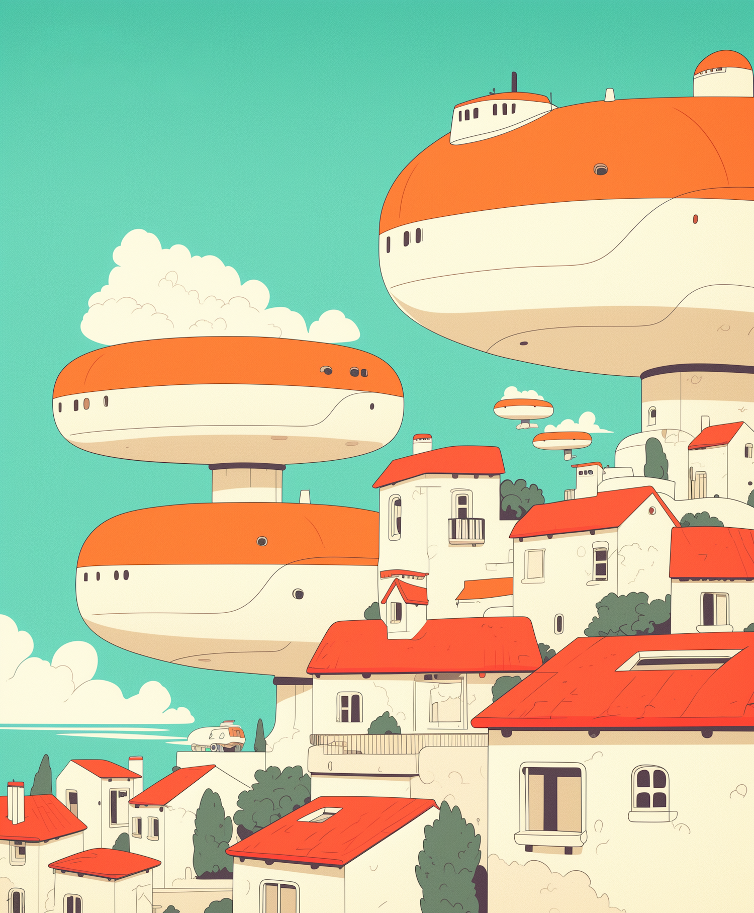 Futuristic floating structures hover over a quaint village with red-roofed houses, set against a vibrant turquoise sky.