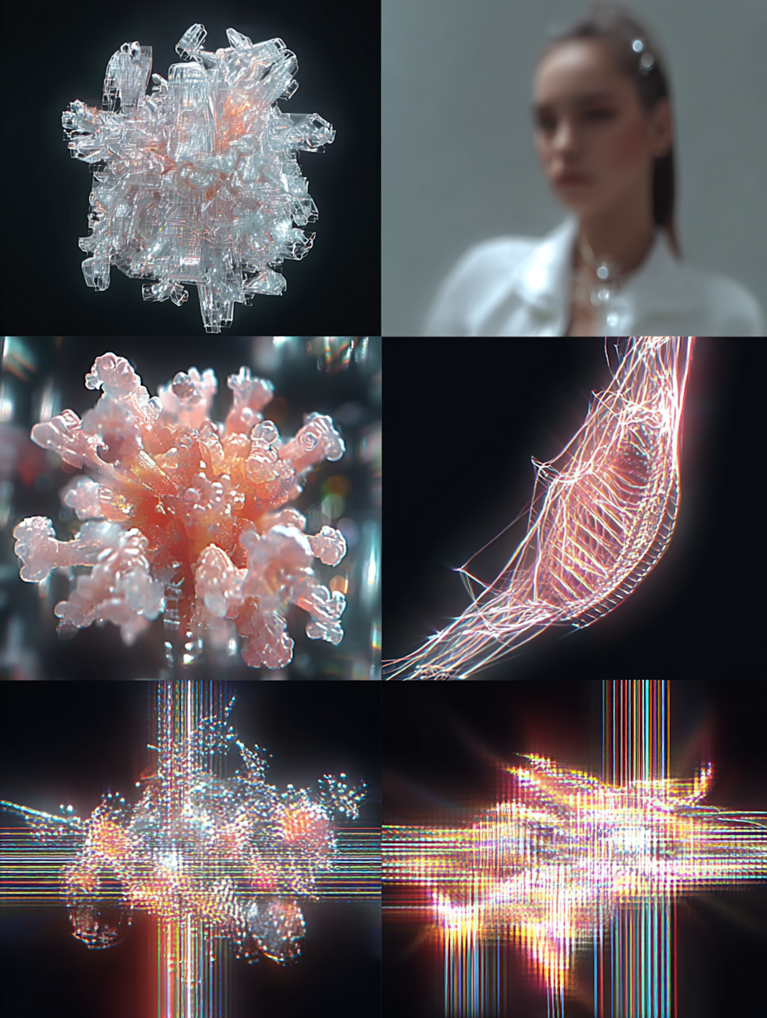 A collage of futuristic visuals blending organic and digital elements, featuring crystalline structures, glowing networks, and light effects.