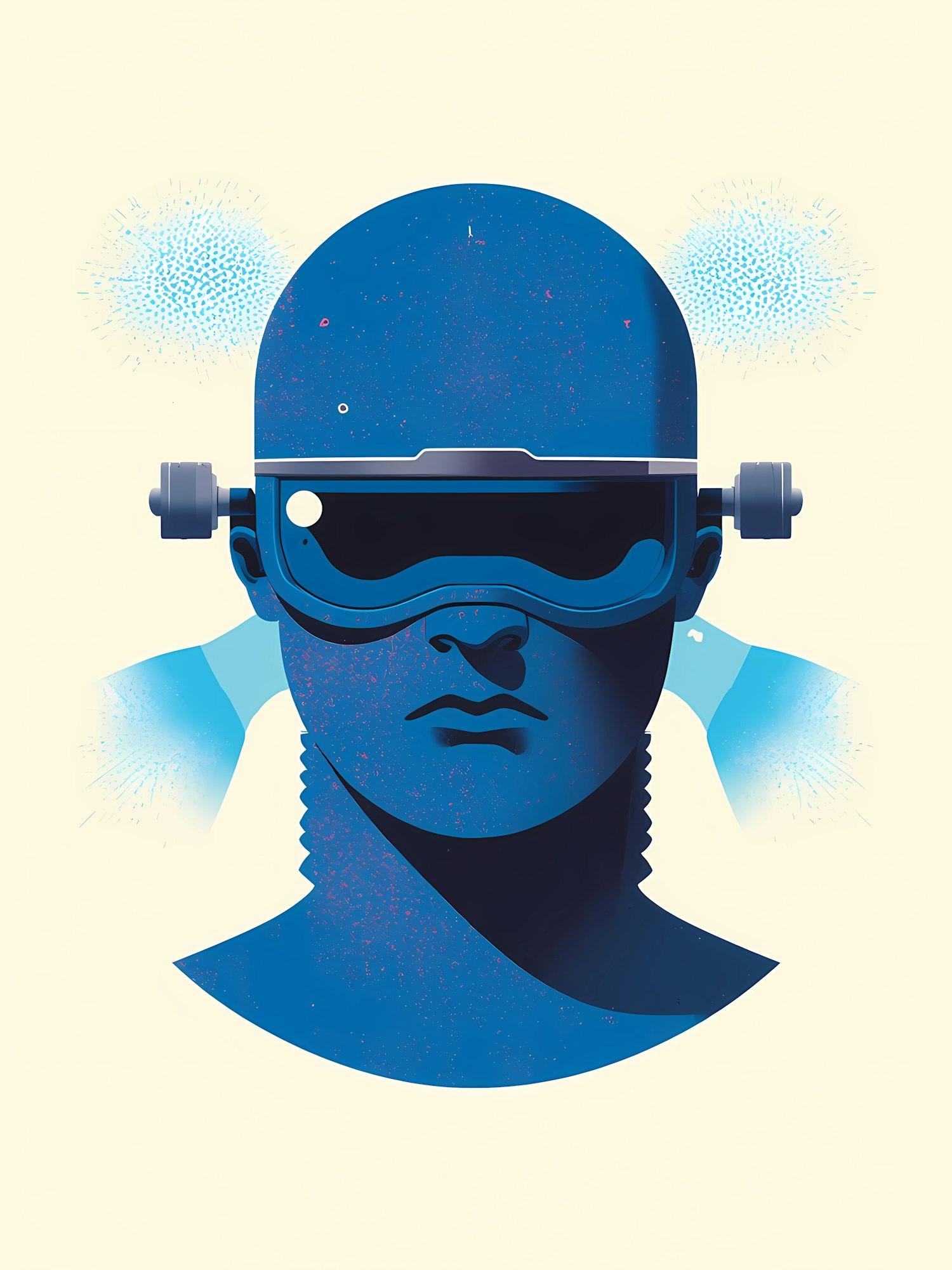 Futuristic illustration of a blue-toned figure wearing VR goggles, set against a light beige background with abstract light effects.