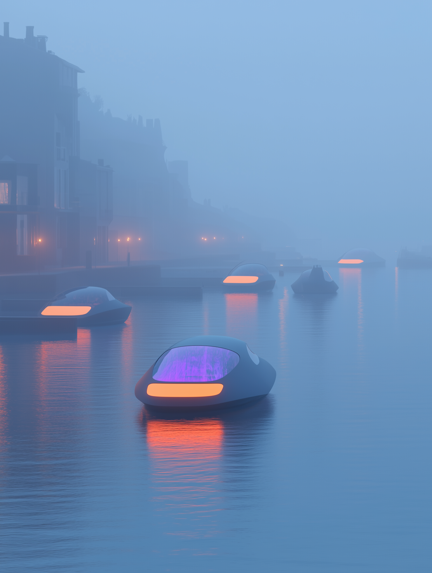 Futuristic pod-like boats with glowing lights float on a misty waterway, creating a serene and otherworldly atmosphere.