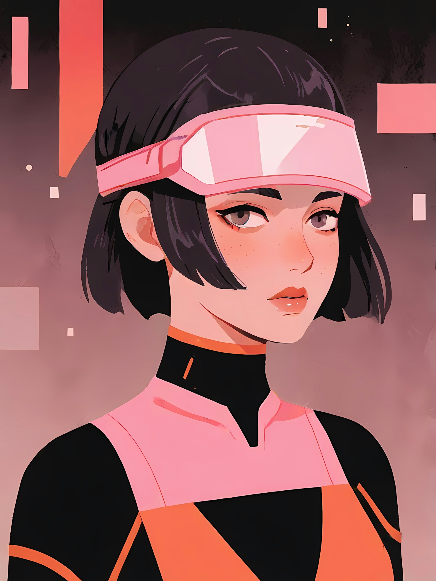 Stylized illustration of a woman with a futuristic pink visor, short black hair, and a pink and black outfit against a geometric background.