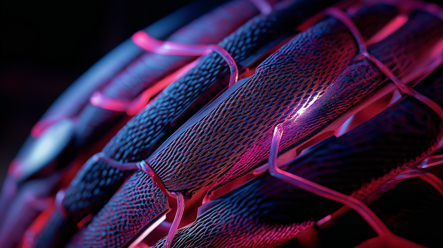Futuristic abstract structure with neon pink and purple highlights, featuring a complex mesh-like texture and glowing appearance.