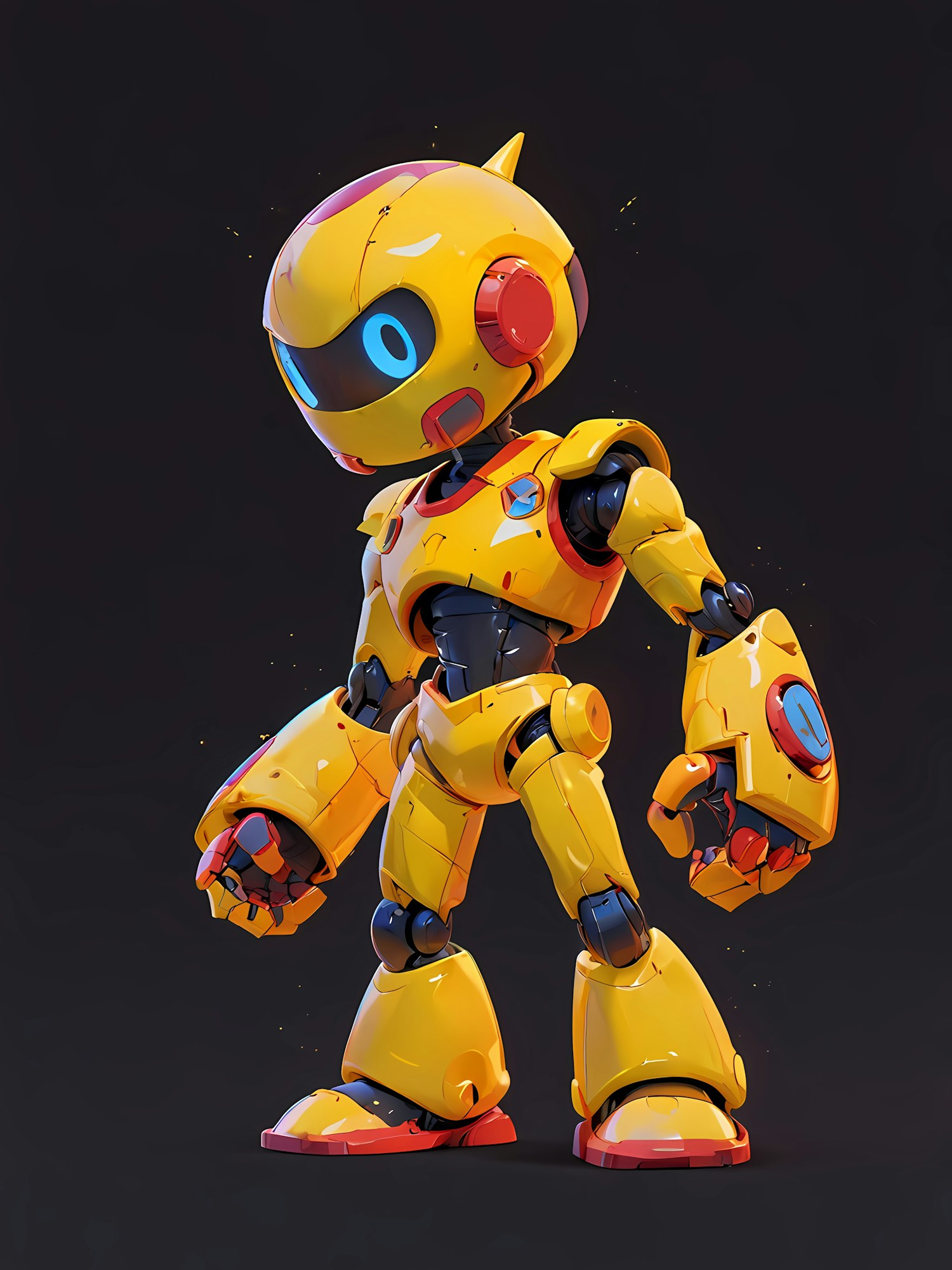 Bright yellow 3D robot with red accents and glowing blue eyes, standing confidently against a dark background. Futuristic and playful design.