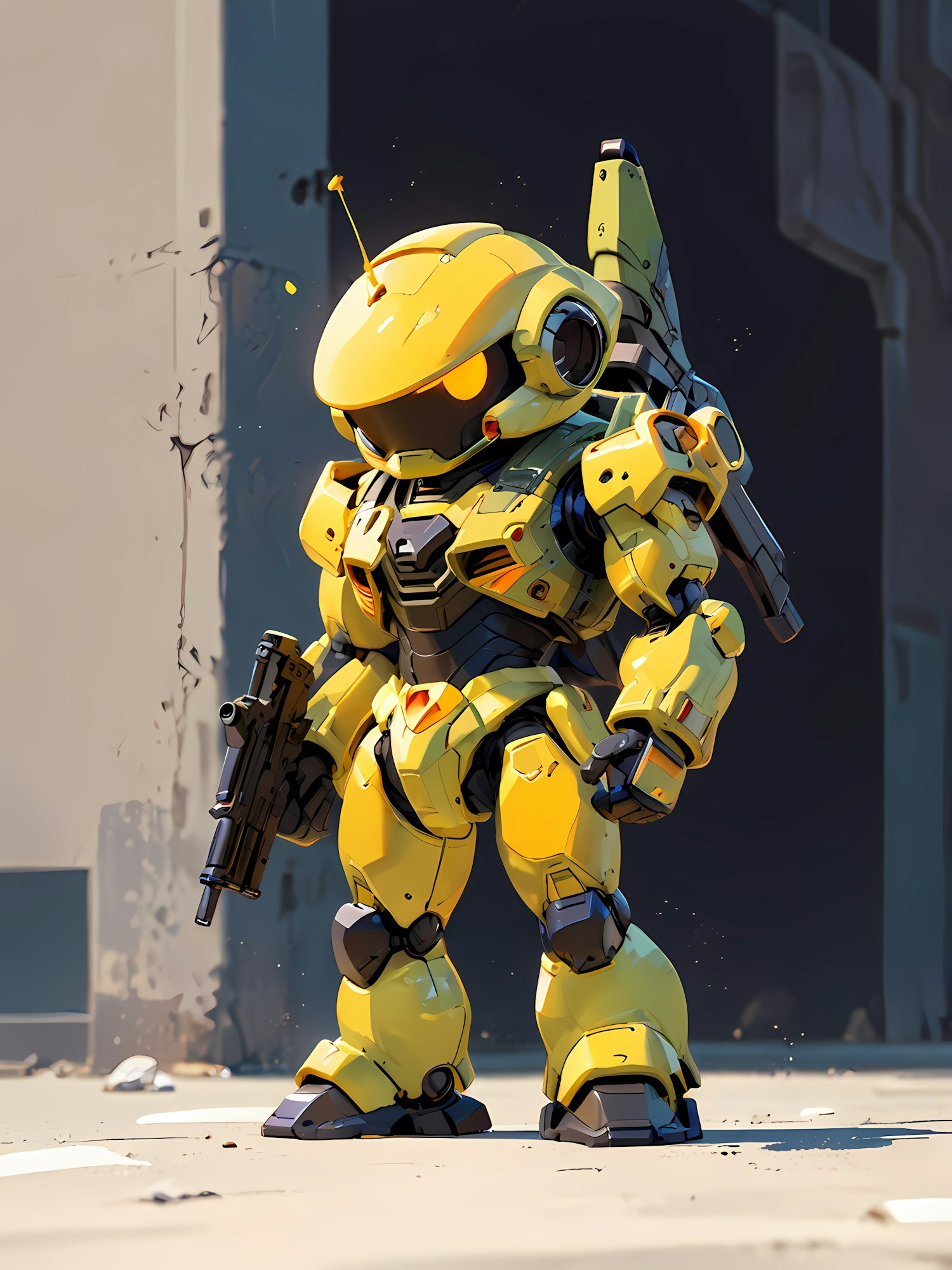 A sleek yellow combat robot with glowing orange visor and weapon, set in a gritty urban environment. Futuristic and powerful design.