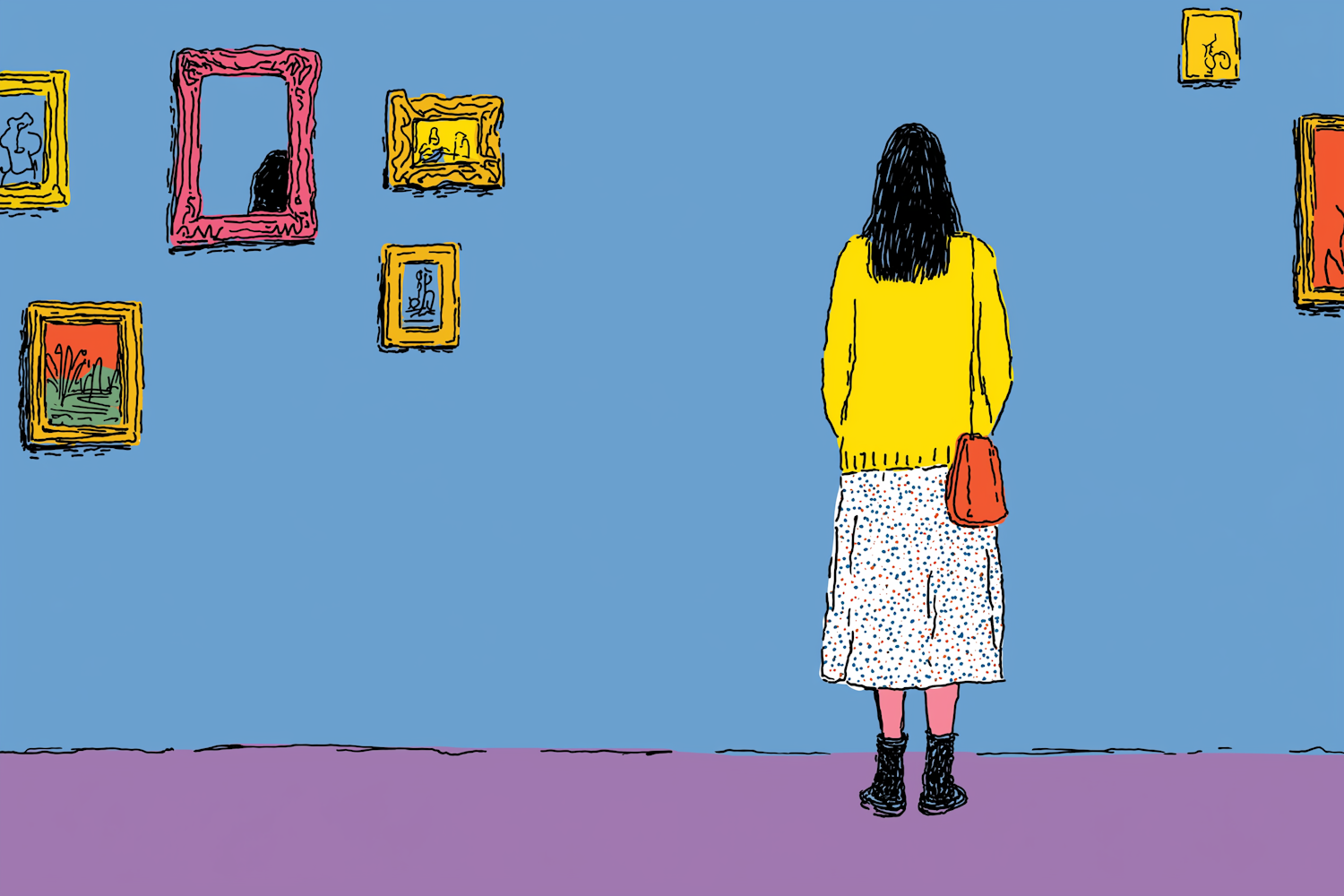 Illustration of a person in a yellow sweater viewing colorful framed art on a blue wall in a gallery, with a vibrant and artistic vibe.