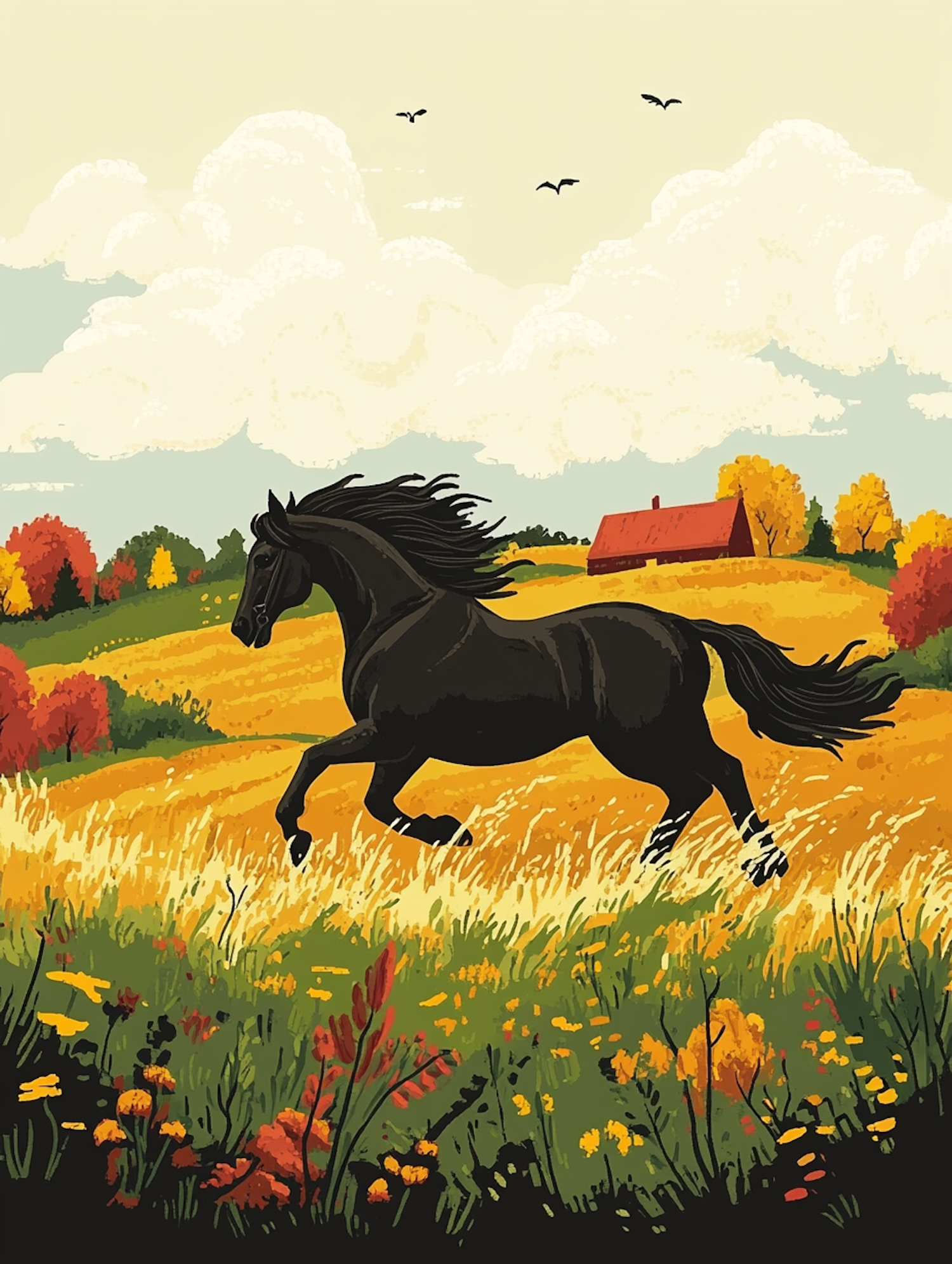 A black horse gallops through a vibrant autumn field with wildflowers, under a pale yellow sky with fluffy clouds and birds.