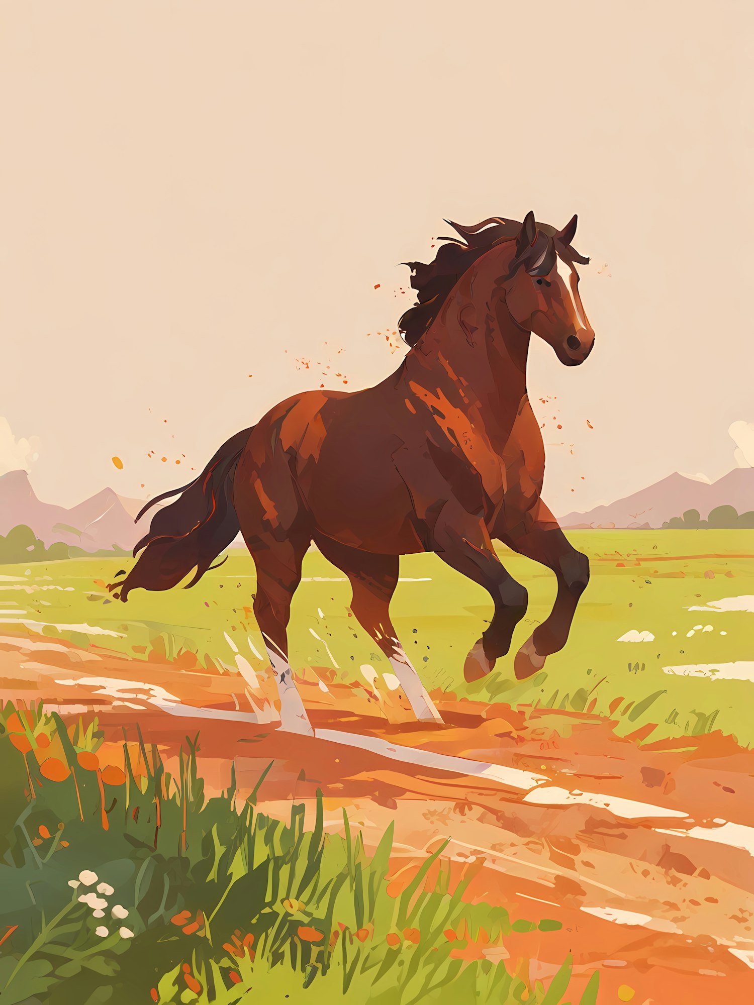 A stunning illustration of a galloping brown horse on a dirt path, surrounded by green fields and wildflowers under a soft beige sky.