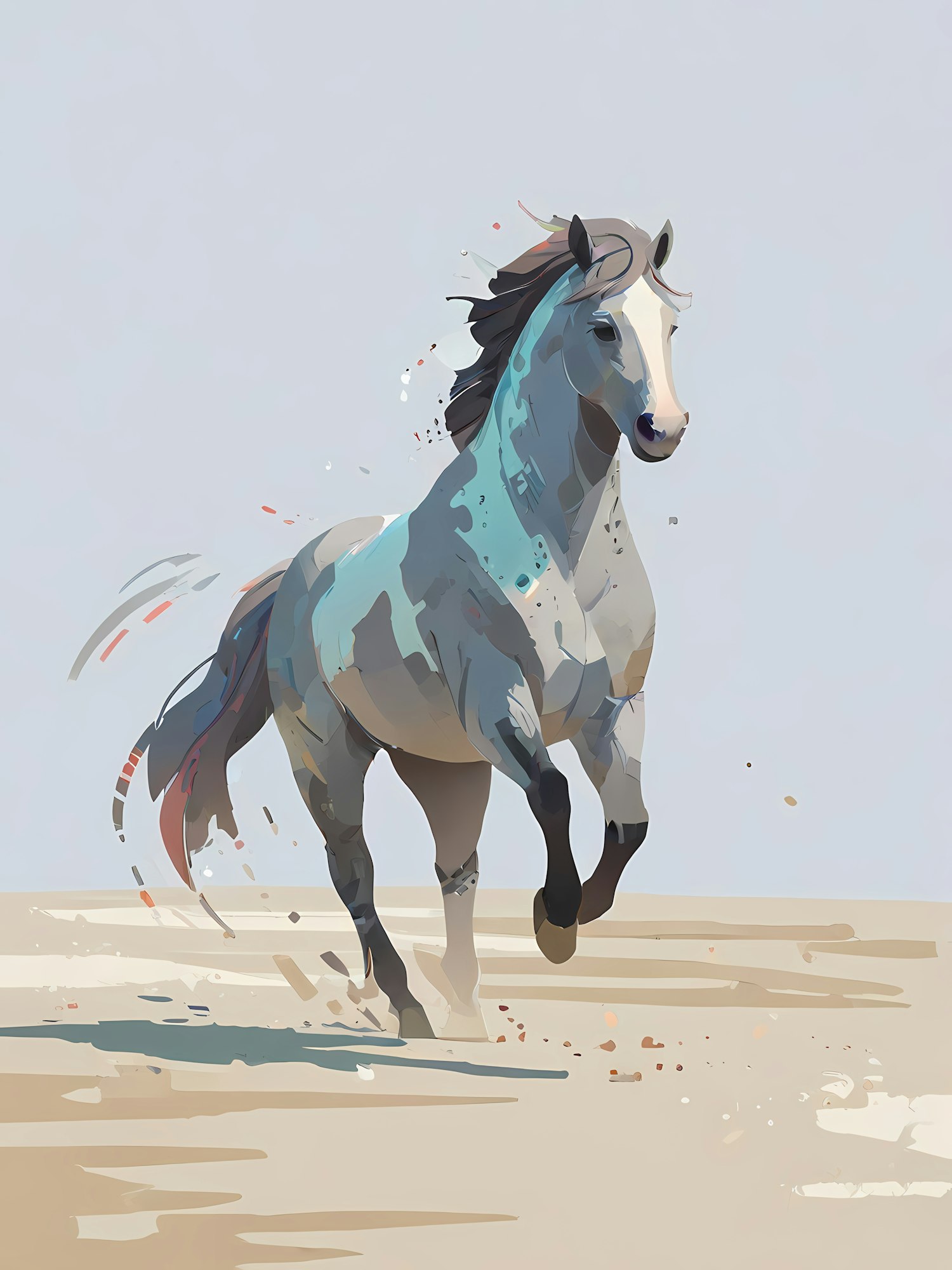 A stunning abstract illustration of a galloping horse in shades of blue and gray, set against a minimalistic desert-like background.