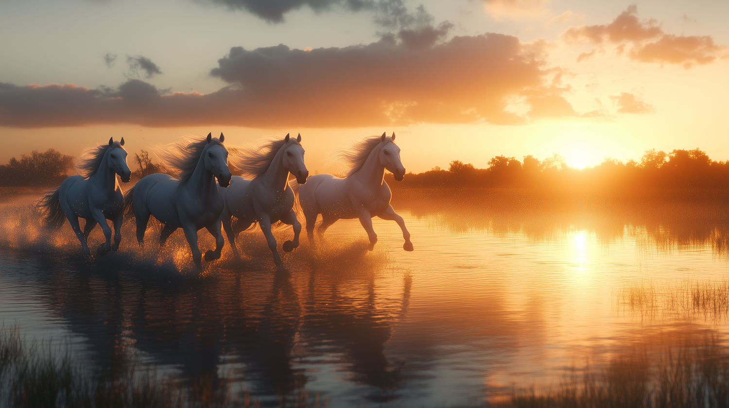 Four white horses gallop through water at sunset, their manes flowing as golden light reflects off the rippling surface. A serene, magical scene.