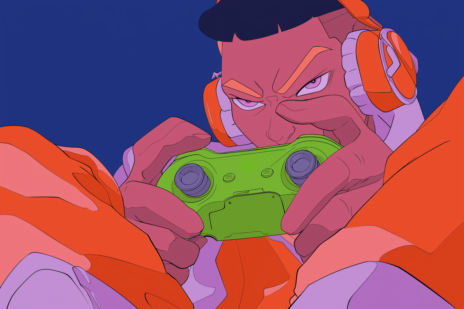 Focused gamer with vibrant headphones and a green controller against a blue backdrop.