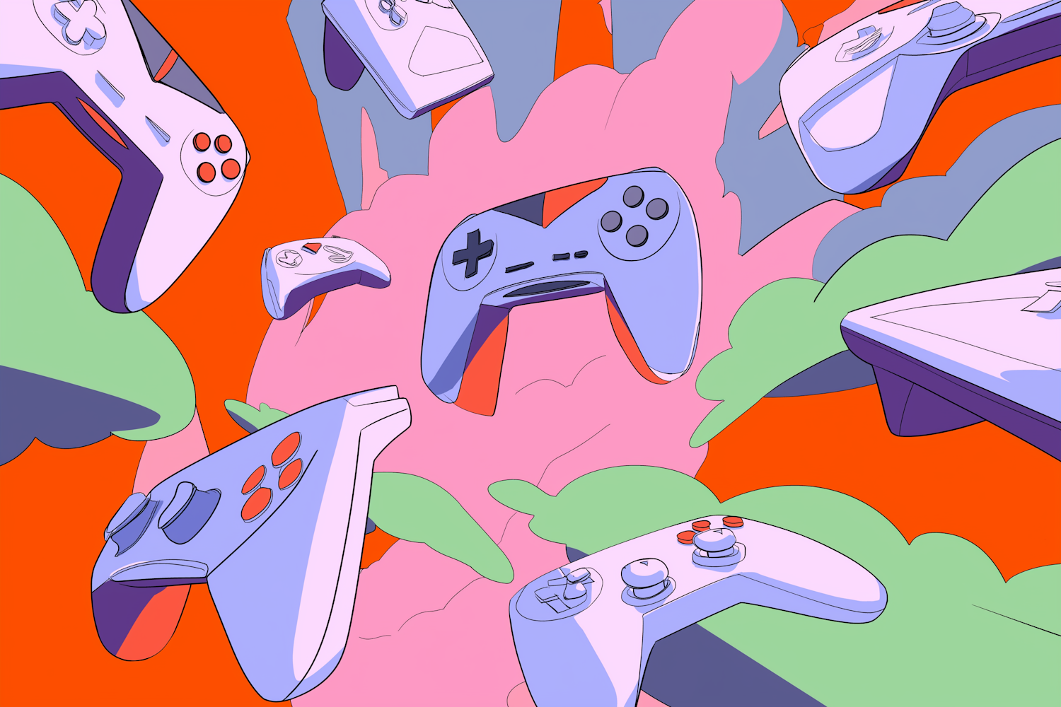 Vibrant illustration of diverse video game controllers against a dynamic background of bright colors and abstract shapes.
