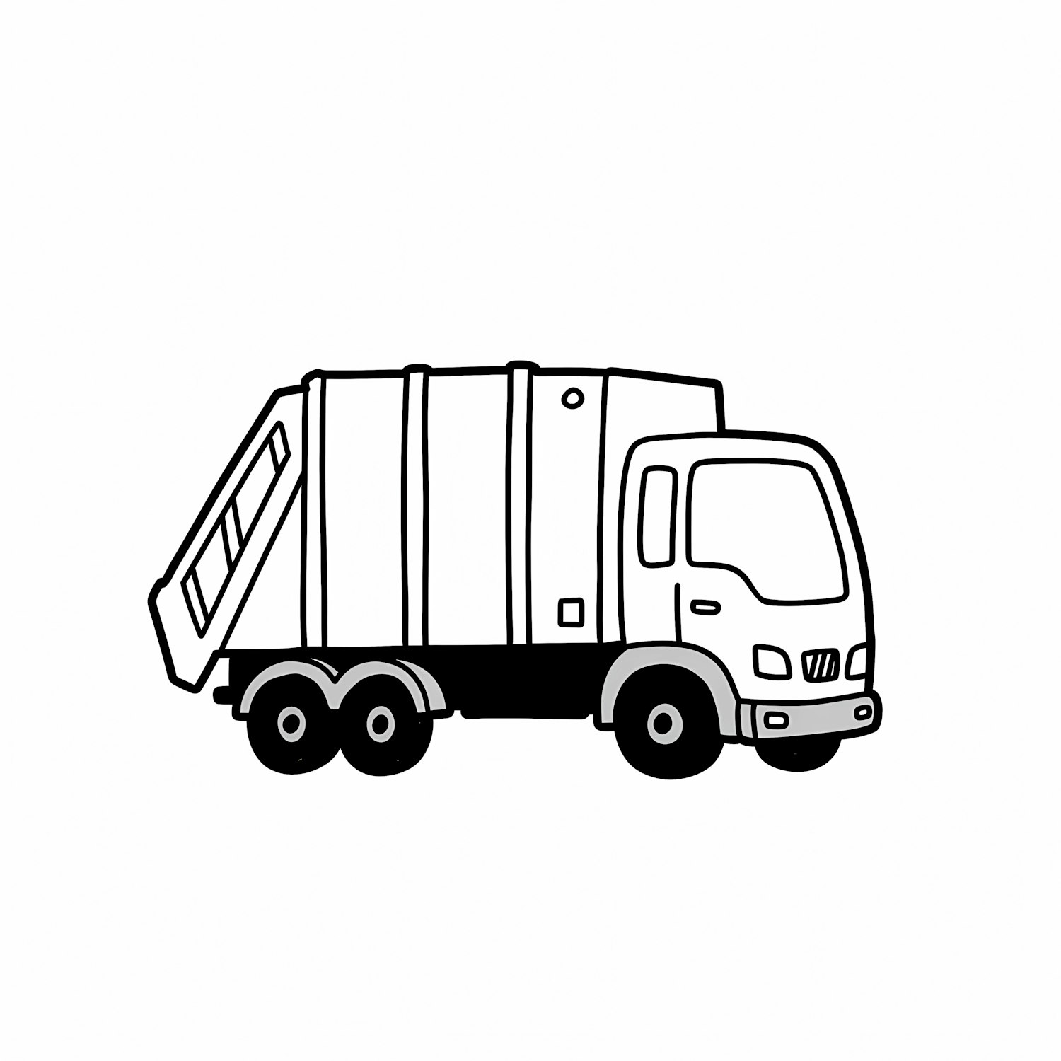Black-and-white illustration of a garbage truck with a detailed side profile and clean lines, set against a plain white background.