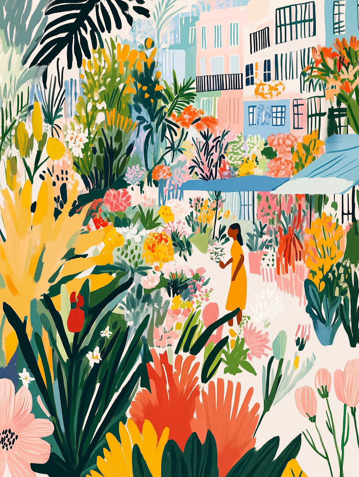 Colorful garden illustration with vibrant flowers, lush greenery, and a woman in an orange dress amidst abstract urban buildings.