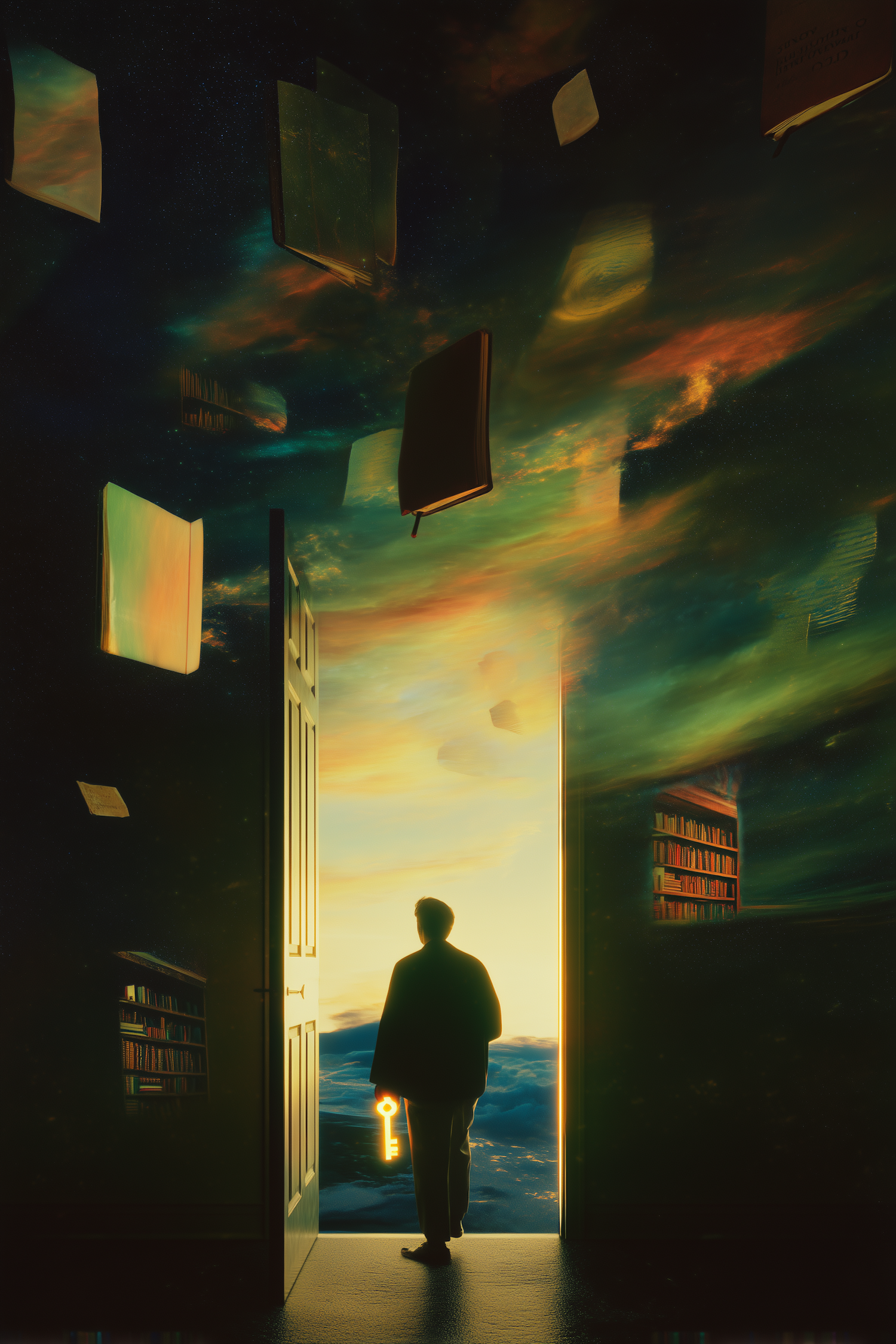 A surreal image of a figure holding a glowing key, standing in a doorway to a vibrant, otherworldly sky with floating books and shelves.