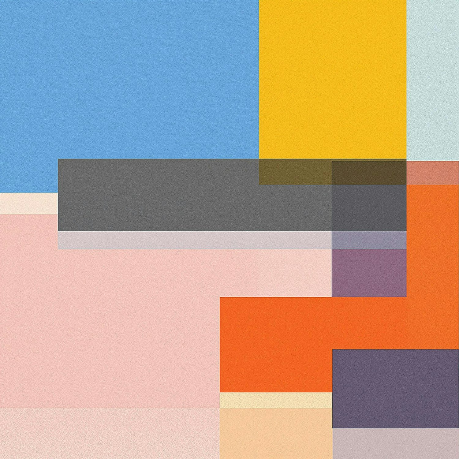 Bold abstract art with geometric shapes in blue, yellow, orange, pink, and gray, creating a modern and vibrant visual composition.