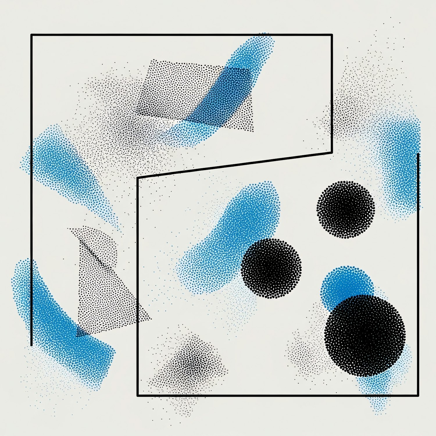 Abstract artwork with black circles, blue gradients, and halftone patterns on an off-white background, creating a dynamic visual composition.