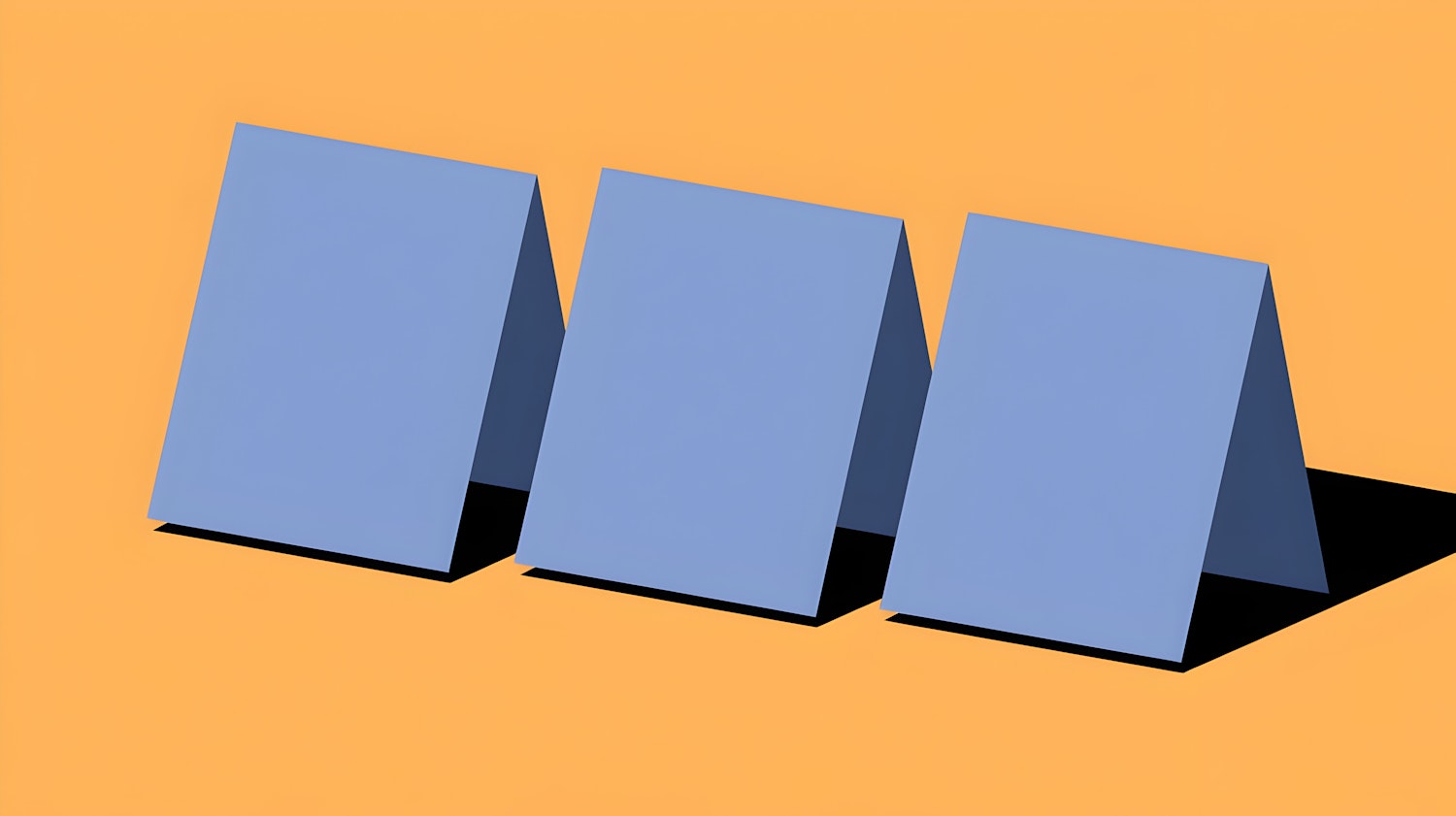 Minimalist design with three blue triangular prisms on an orange background, casting sharp shadows. Bold and modern geometric aesthetic.
