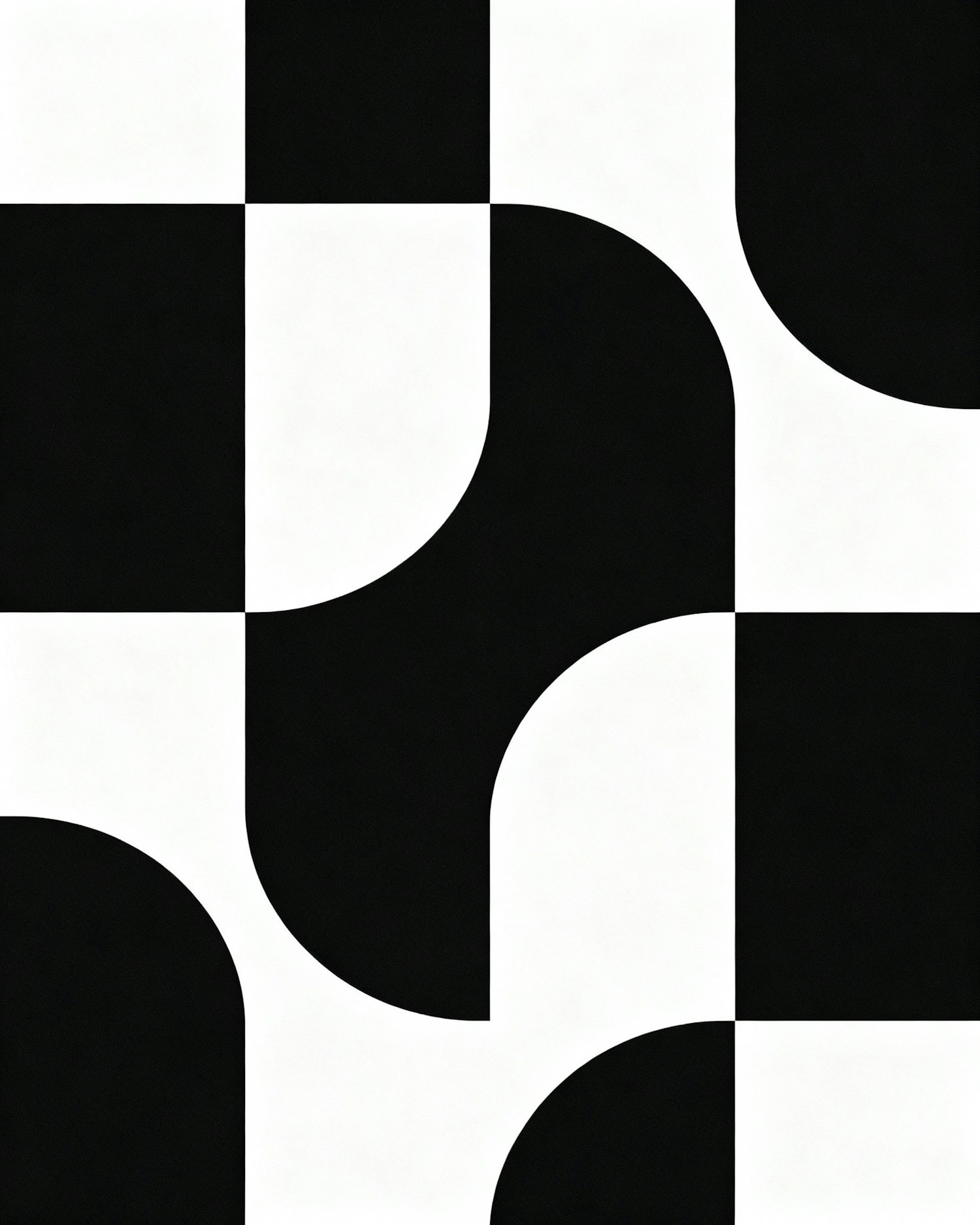 Black and white geometric pattern with squares and curves, creating a bold and modern visual effect.