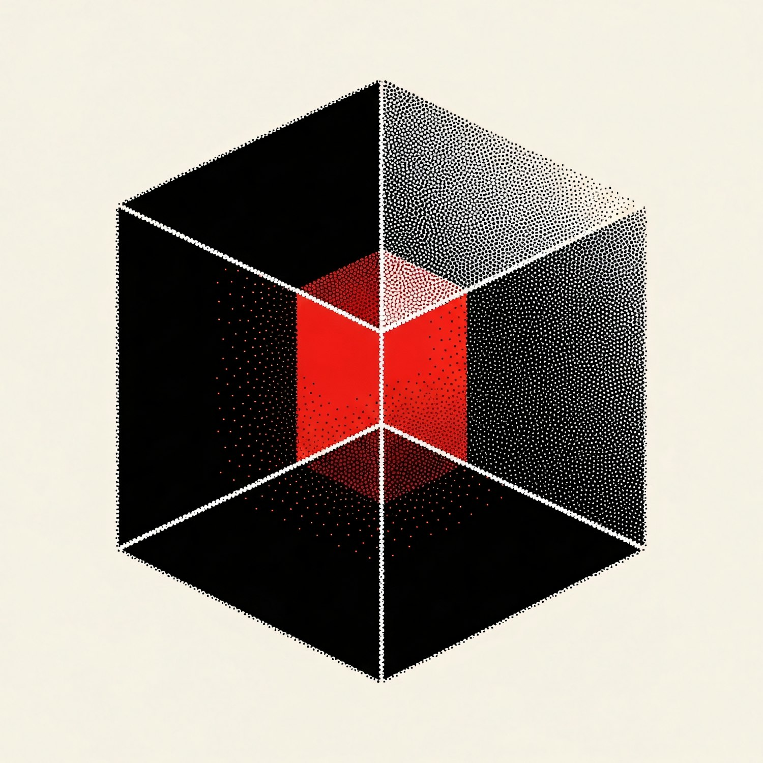 A striking geometric cube illustration with a red core and dotted black and white patterns, creating a modern and abstract 3D effect.