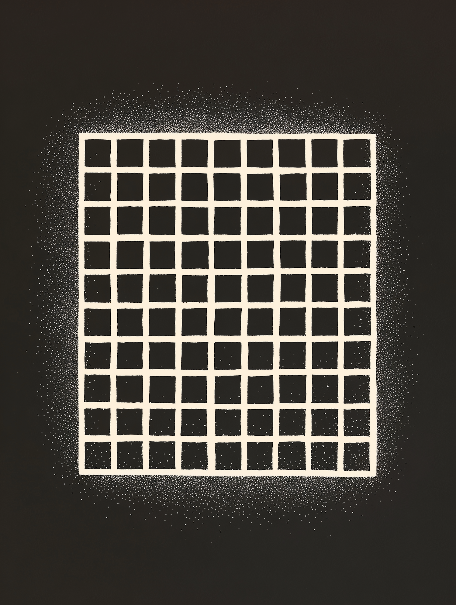A minimalist grid of white squares on a black background, surrounded by a gradient of white dots for a glowing effect.
