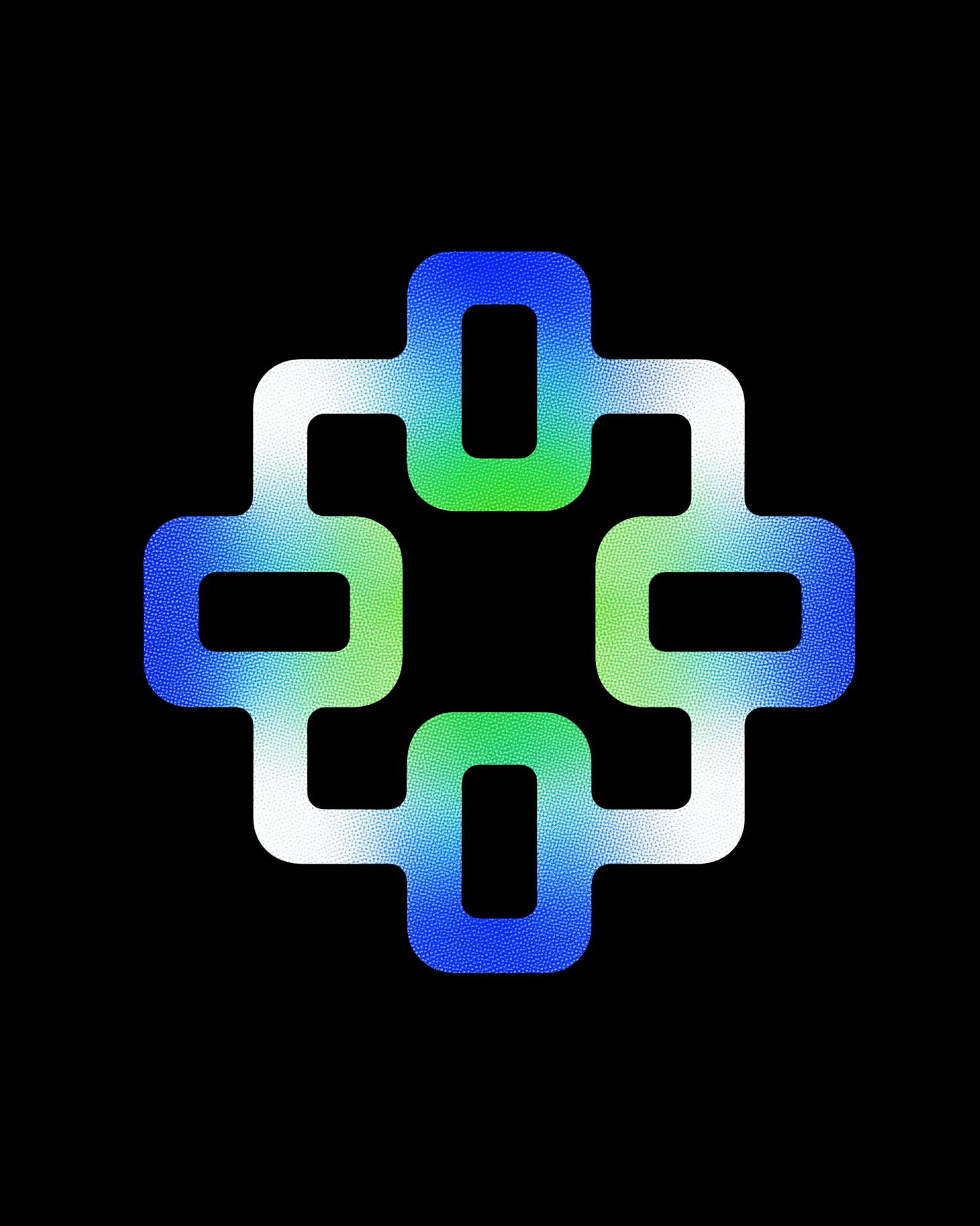 A modern geometric design with blue-to-green gradient rectangles forming a cross pattern on a black background.