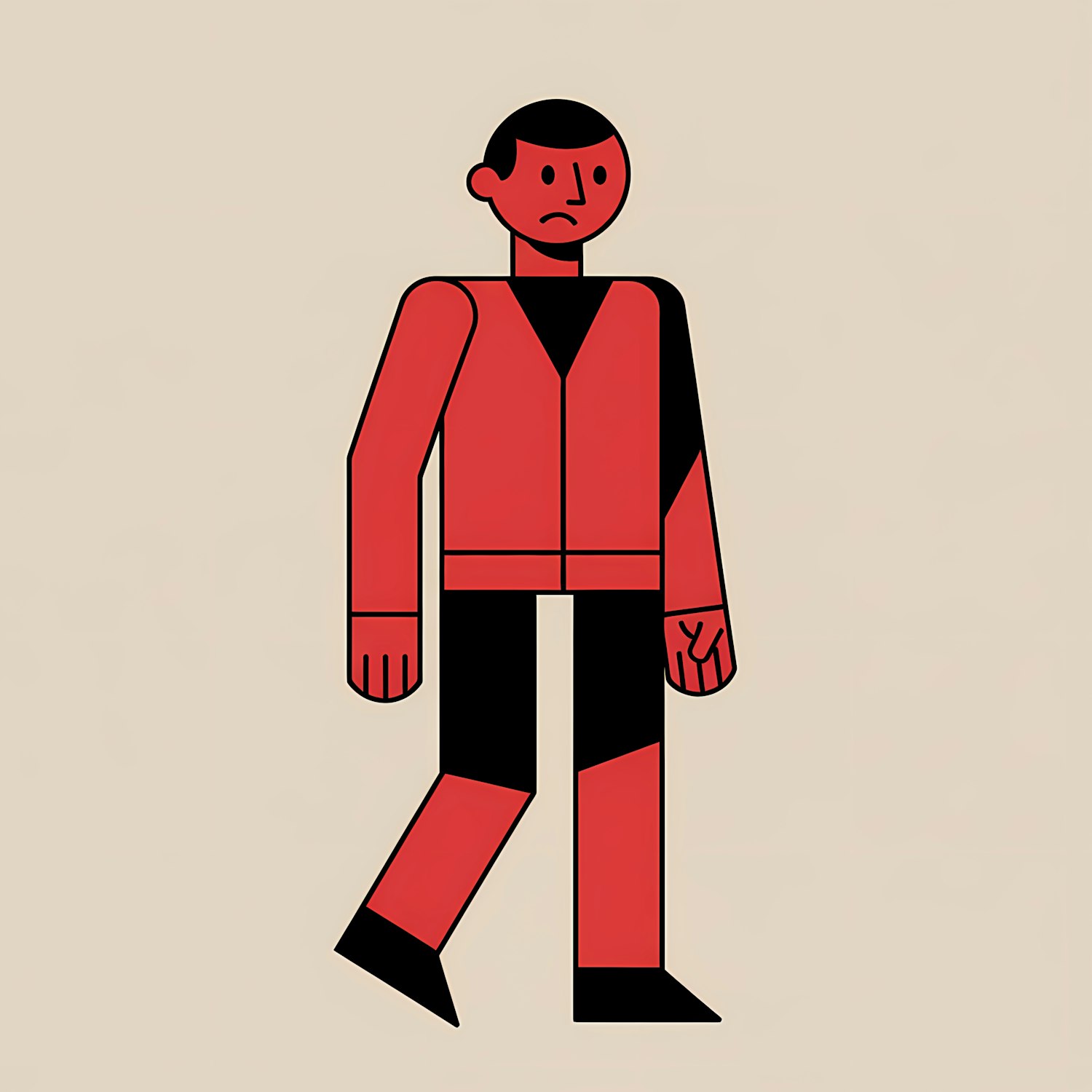 A minimalist illustration of a geometric human figure in red and black on a beige background, showcasing a modern and abstract style.