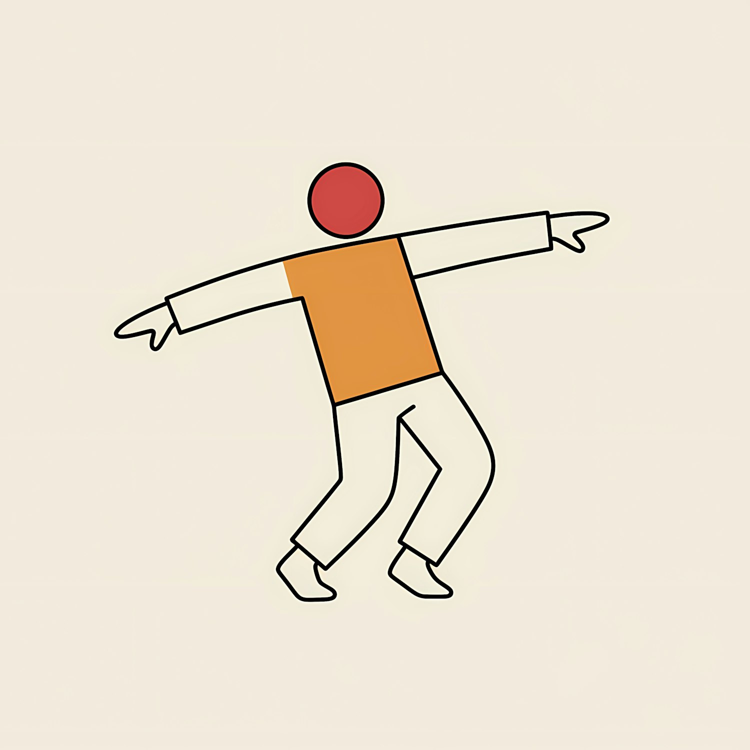 Minimalist illustration of a geometric human figure in motion, featuring a red head, orange torso, and white limbs on a beige background.