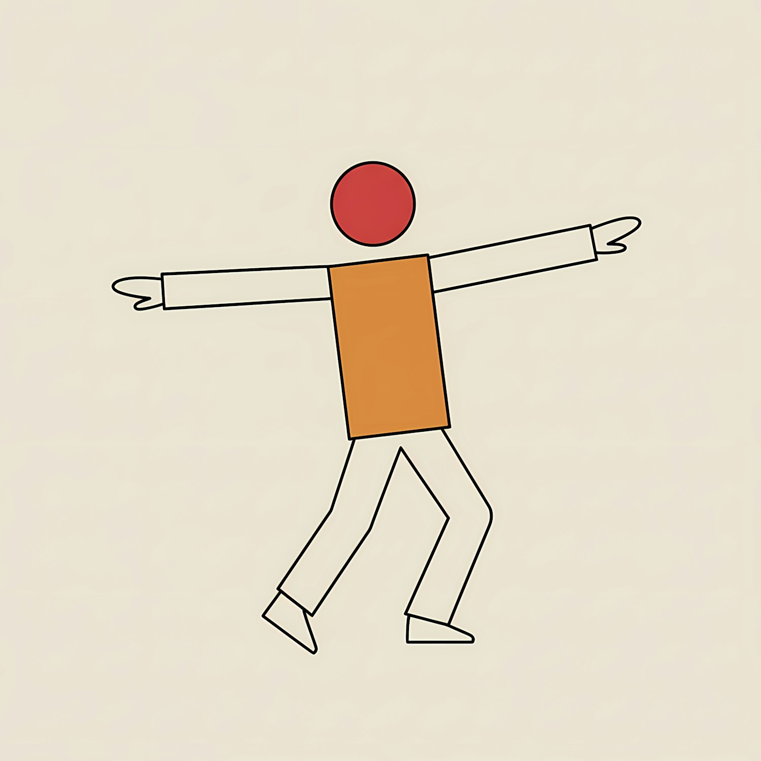 Minimalist illustration of a geometric human figure in motion, featuring a red head, orange torso, and white limbs on a beige background.