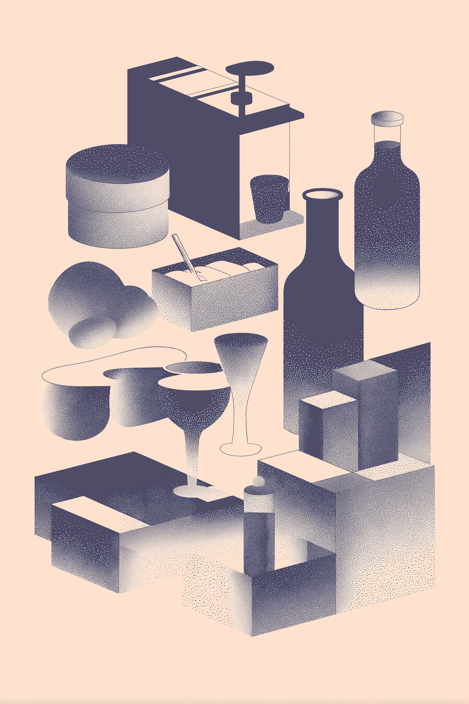 Stylized illustration of kitchen and dining objects in blue tones on a beige background, featuring a modern and minimalistic design.