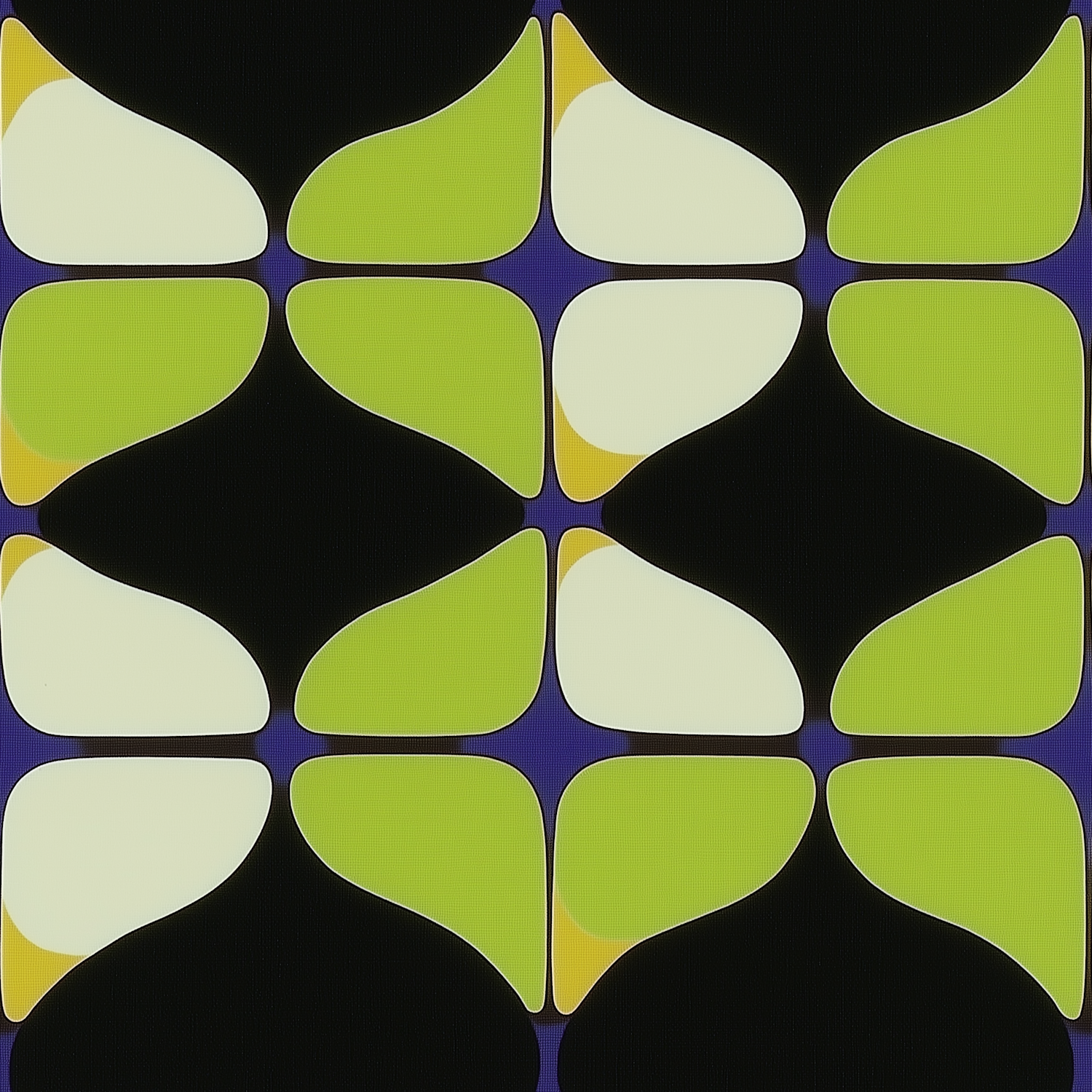 Vibrant geometric pattern with lime green and cream shapes on a black background, outlined in purple. Modern and retro design.