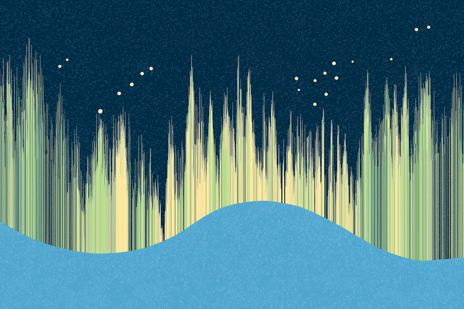 Abstract style illustration of a night setting with vertical yellow-green spikes over soft blue hills, set against a textured starry sky.
