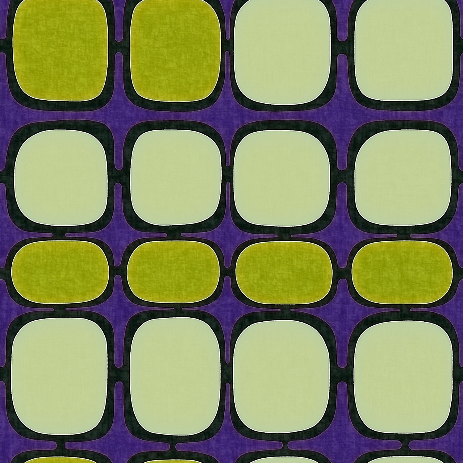 Retro geometric pattern with olive and light green shapes on a purple background, outlined in black for a bold, vintage look.