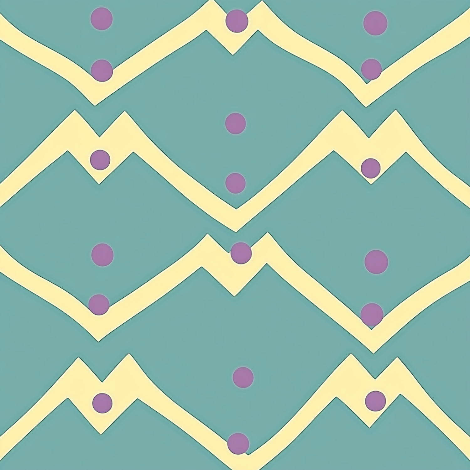Geometric pattern with yellow zigzags and purple dots on a teal background, creating a retro and playful design.